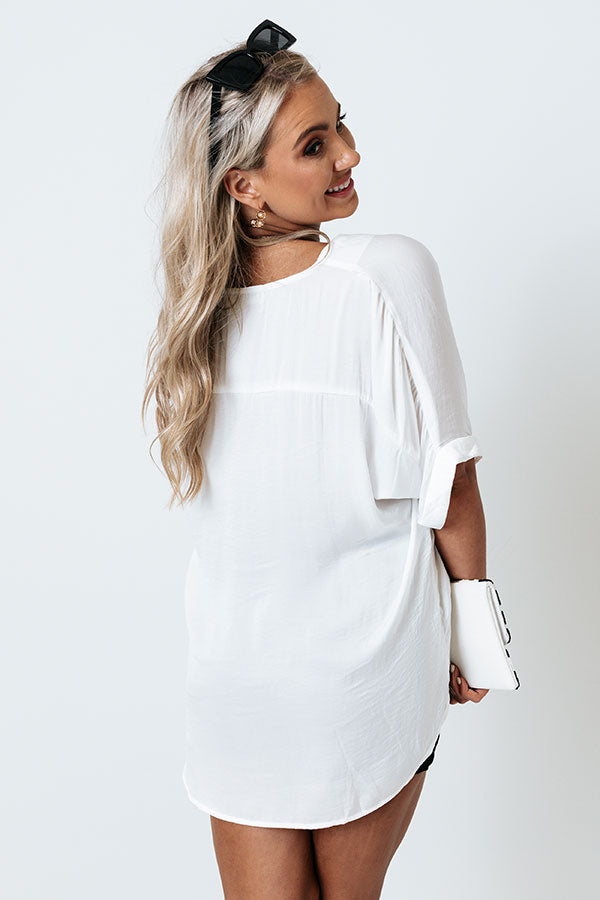 You will look so sweet in this chic white shift top featuring lightweight and breezy satin material, a v-cut neckline, short loose sleeves with rolled cuffs, and a draped silhouette that falls into a rounded tunic-length hemline! Measurements