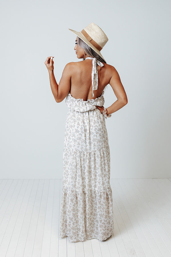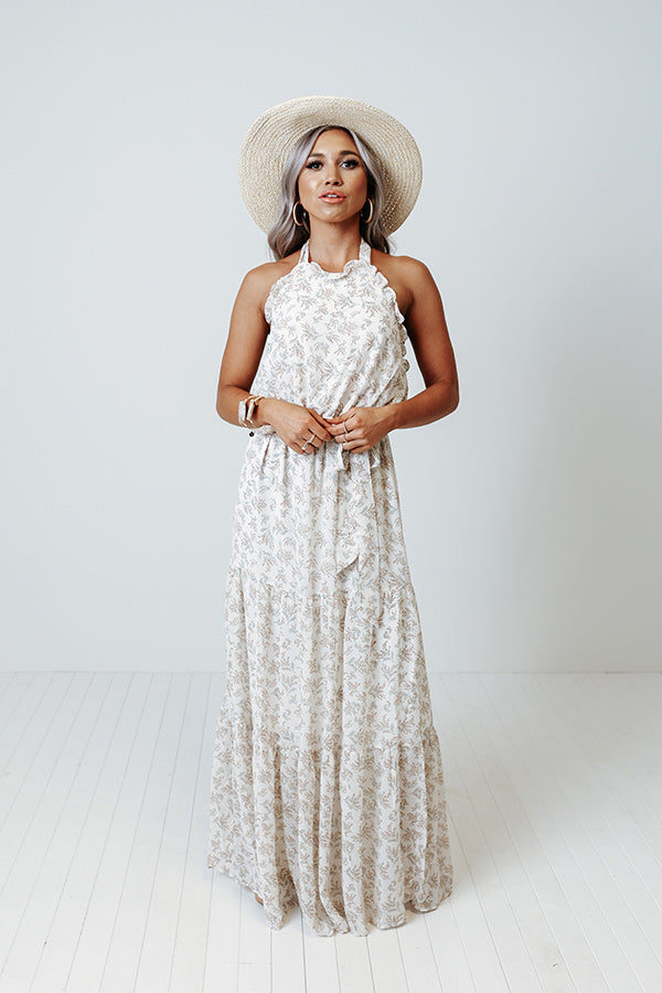You are sure to feel nothing but happiness when you dress to impress in this beautiful ivory colored maxi featuring lightweight flowy material patterned with a subtle floral print, a high neckline with a halter tie closure, ruffled trim detailing, a cinched waistline with a tie belt, and a relaxed tiered skirt silhouette that cascades into a straight ankle-length hemline! Measurements