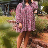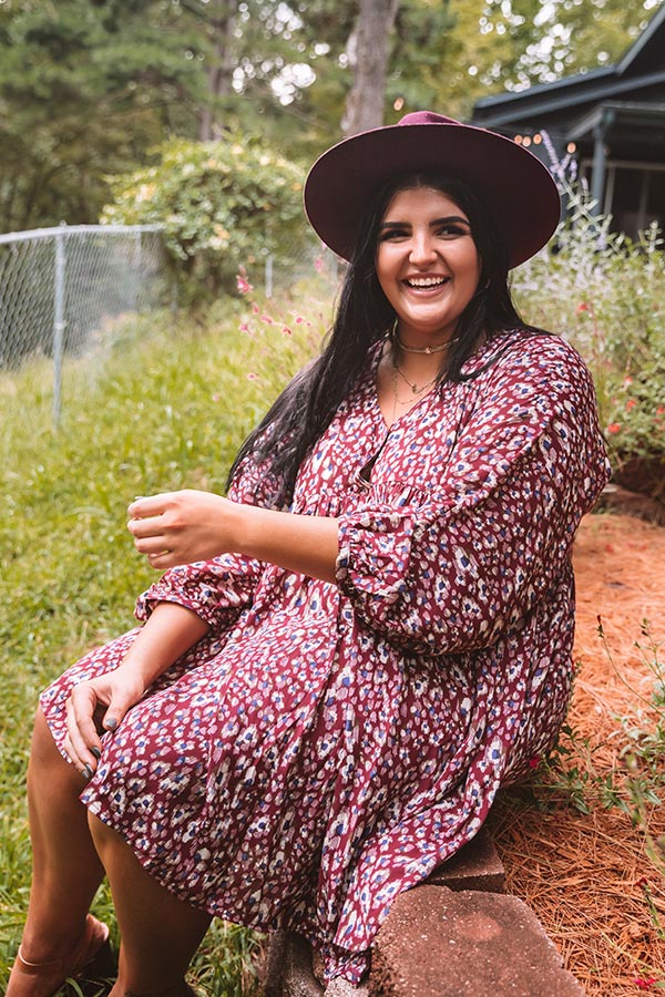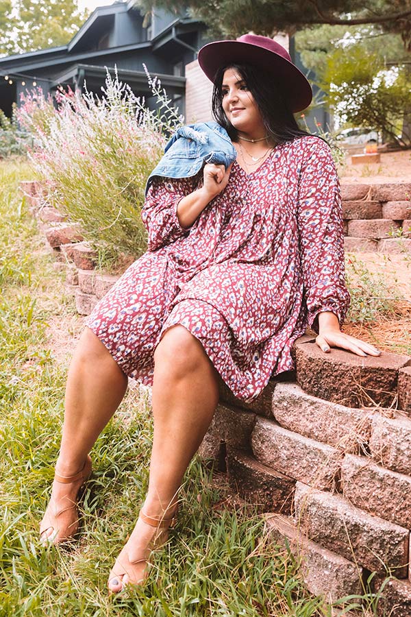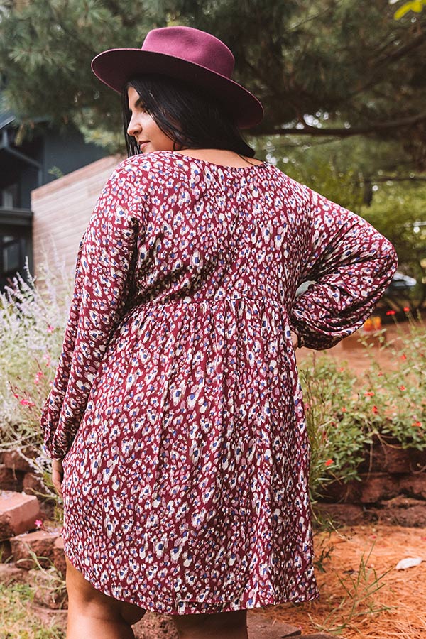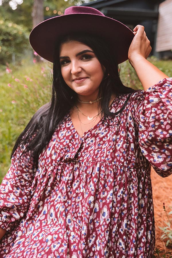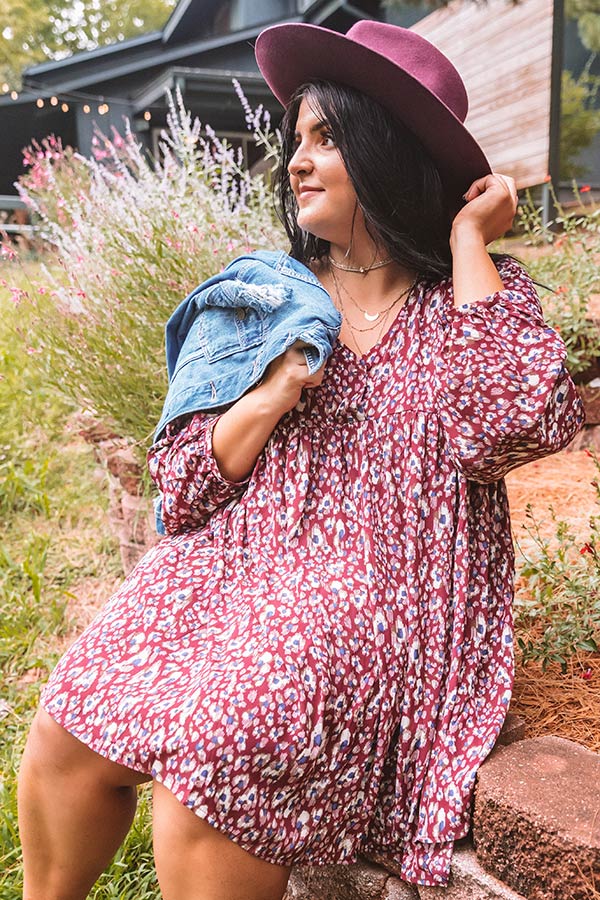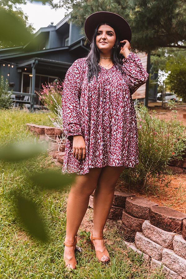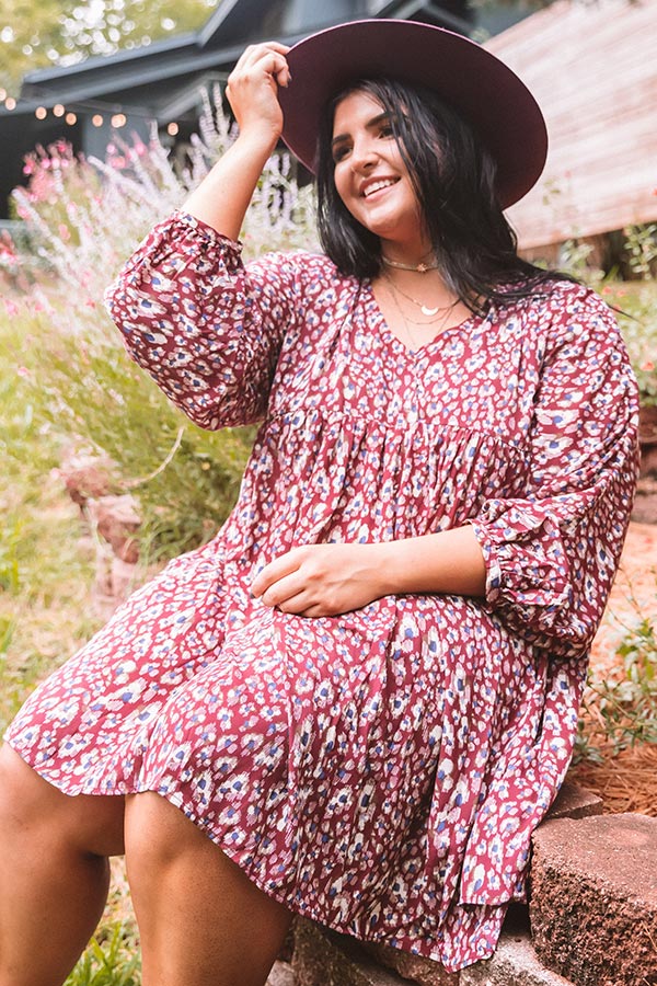 Plus Size - We think you'll agree with us when we say this darling wine hued dress deserves an "honorable mention" with its lightweight flowy material, an abstract dark periwinkle, pink, and white spotted print, a button up bodice with a v-cut neckline, long loose sleeves with fitted cuffs, and a relaxed babydoll silhouette that falls into an uneven mid-thigh length hemline! Measurements