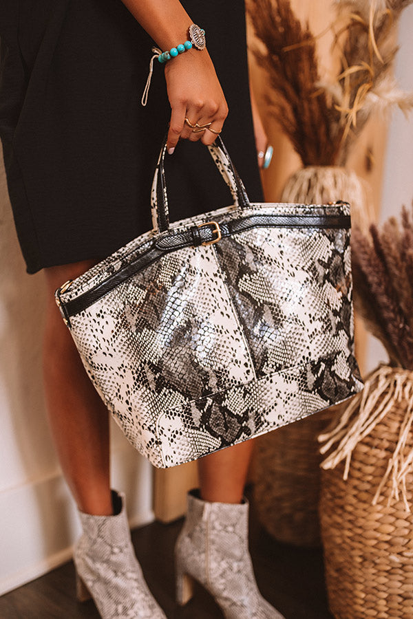 We believe this striking tote needs an "honorable mention" with its sleek faux leather material, black snake print pattern, two rounded tote handles, an accent buckled strap, a removable shoulder strap, a zip closure pocket on the back, and a spacious pouch with additional inside pockets!