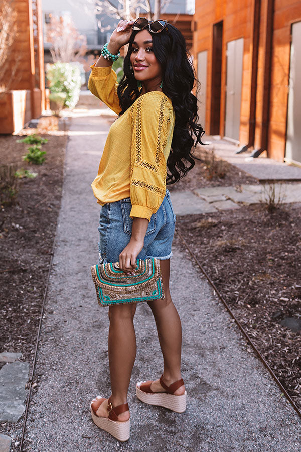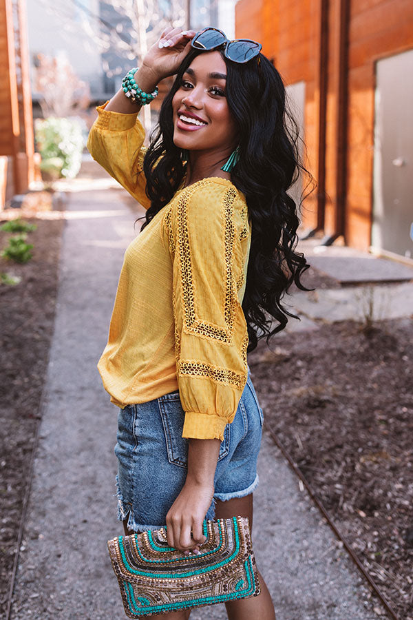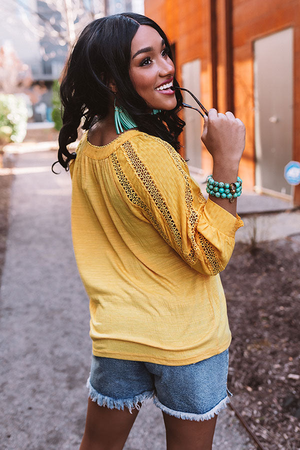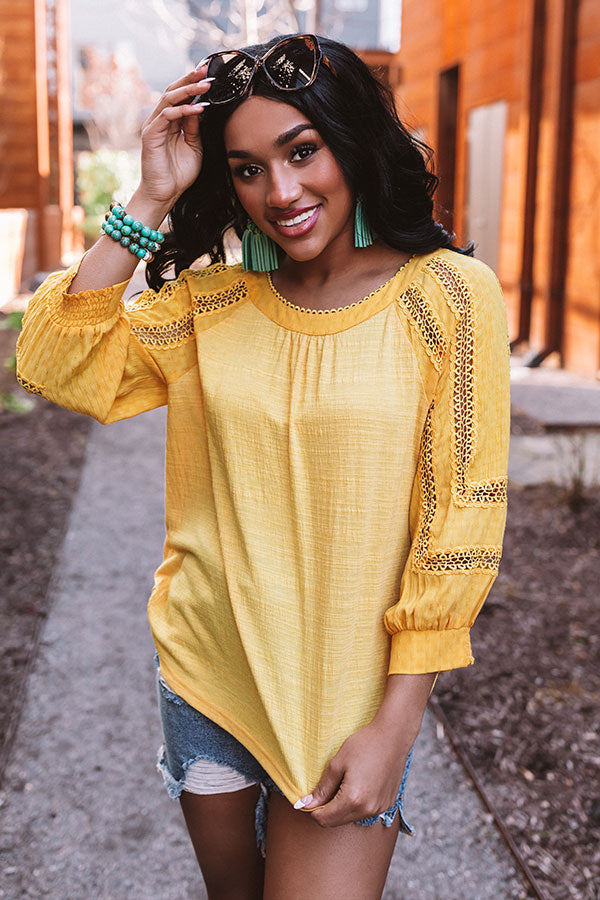 We have no doubt you will be hooked on how delightful this golden honey hued transitional top is! It features lightweight flowy material, a high rounded neckline, 3/4-length bishop sleeves with intricate semi-sheer crochet detailing and fitted cuffs, and a relaxed silhouette that falls into a rounded hemline!