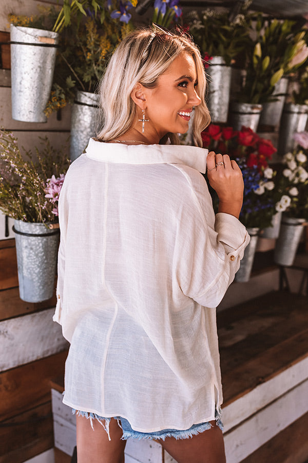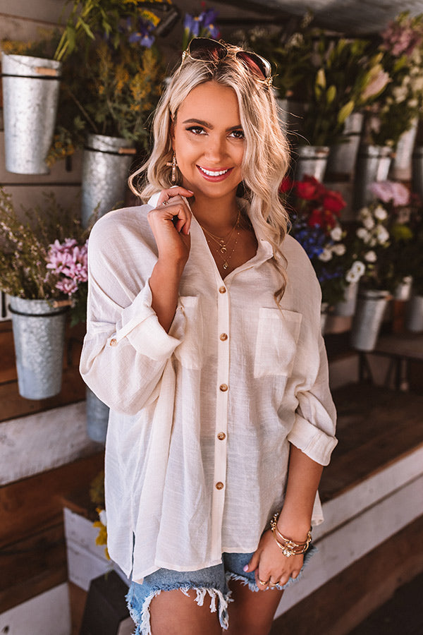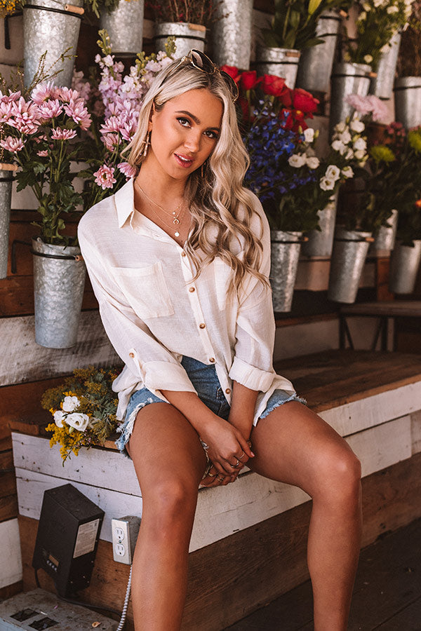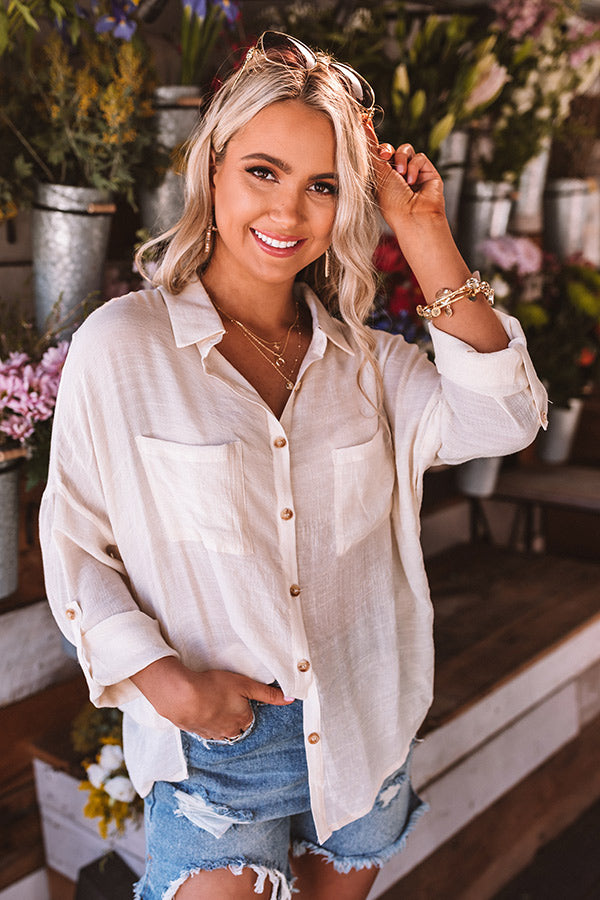 Keep it casual but classy in our sophisticated cream colored 'Hopelessly Devoted' top featuring lightweight flowy material, a button up front with a collared neckline, long loose sleeves with roll tab cuffs, two accent chest pockets, and a relaxed silhouette that falls into a rounded hemline! Measurements