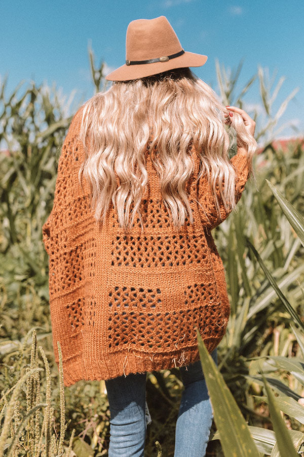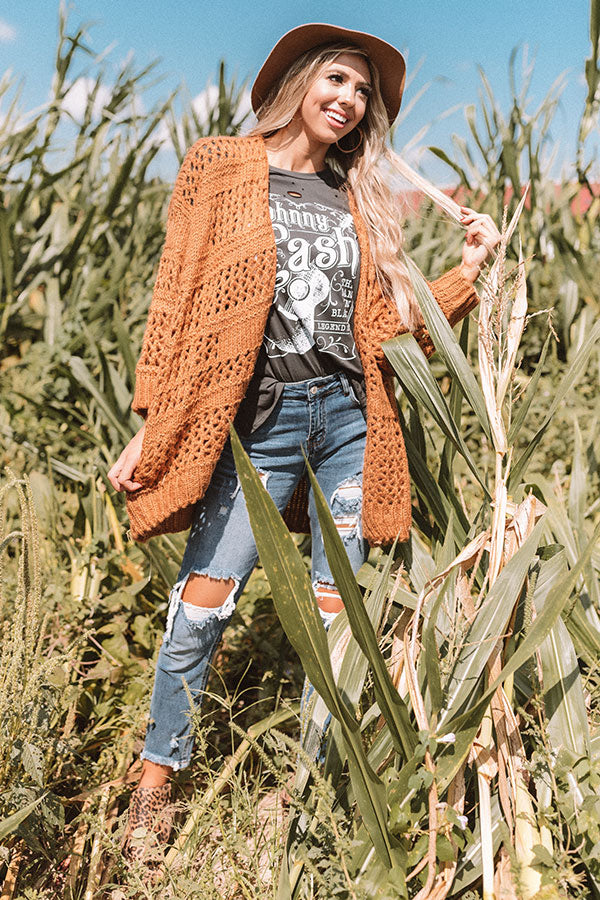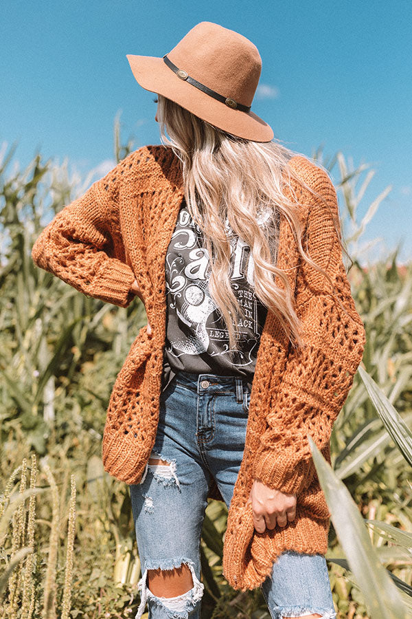 Stay warm and cozy while sipping "hot cocoa by the fire" in this camel colored cardigan featuring a loose eyelet knit material, long oversized sleeves with fitted cuffs, and an open front silhouette that falls into a mid-thigh length straight ribbed hemline! You can style this versatile piece with just about anything from a basic tank to a sweater, jeans to dresses, wedges to sandals, clutches to totes, and hats to earrings! Measurements