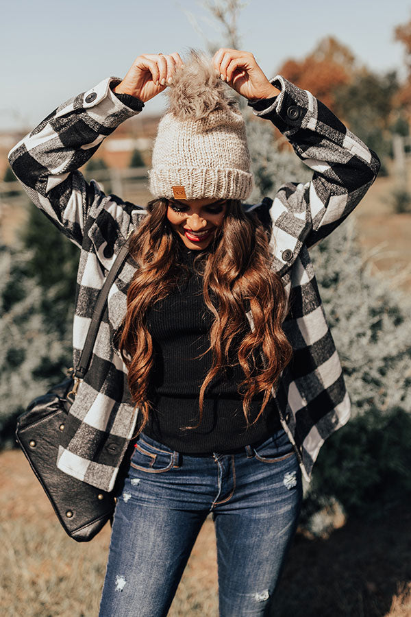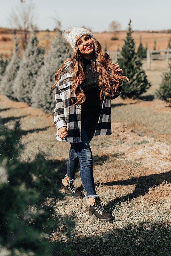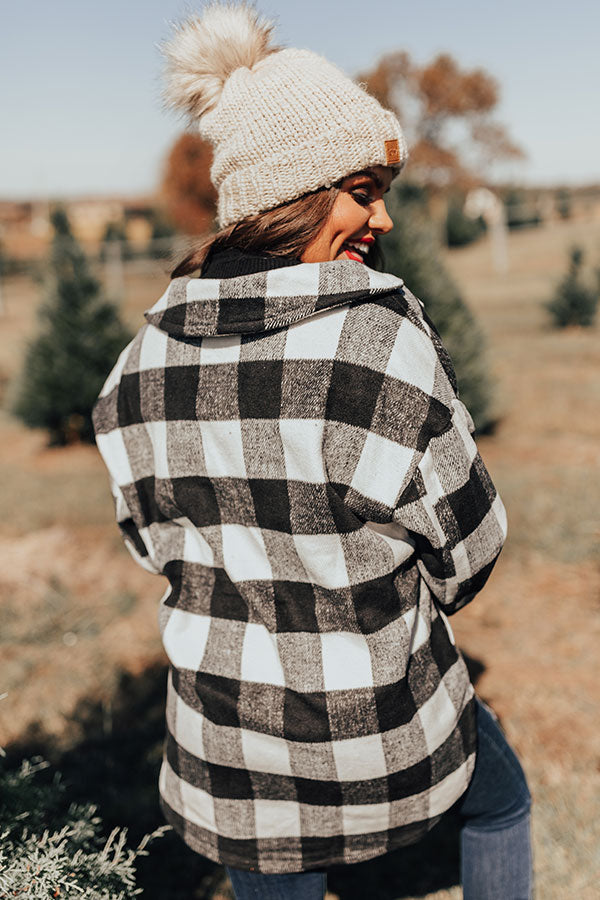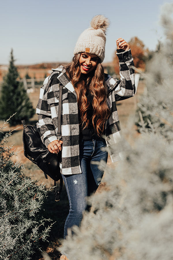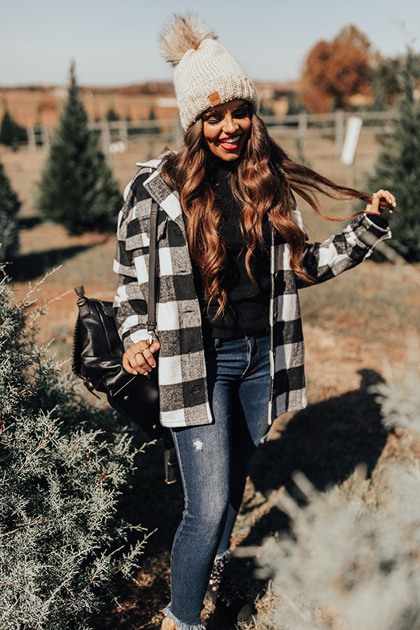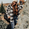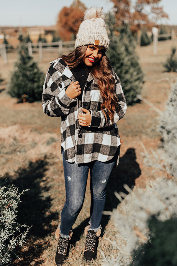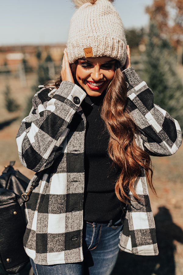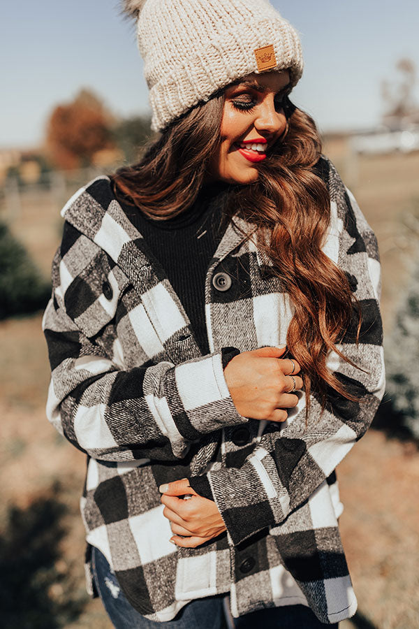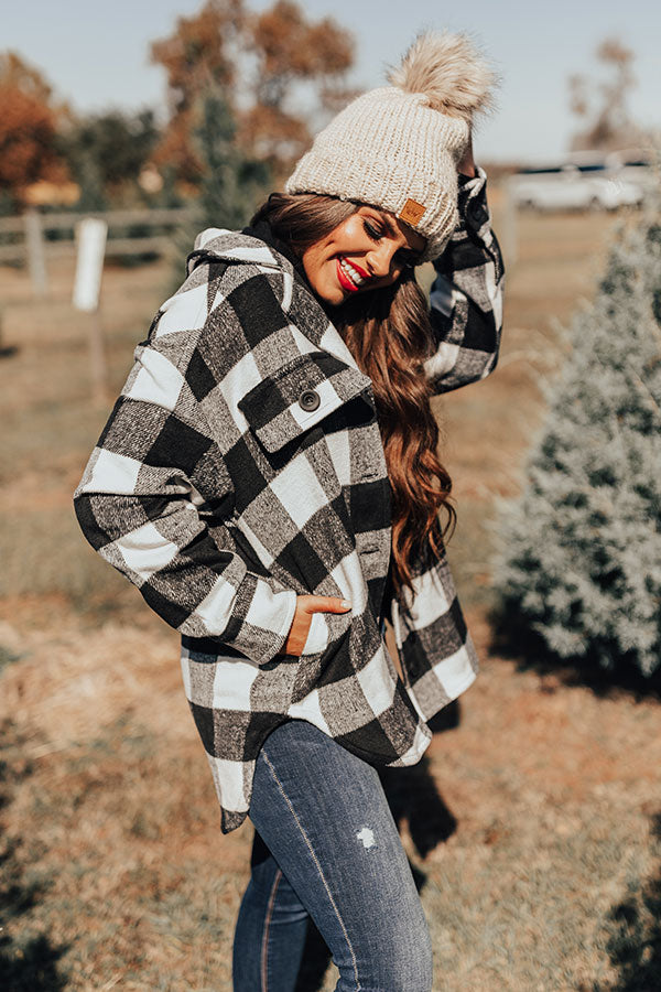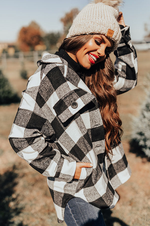 Colder weather has arrived and so has our fave new outerwear piece! Our adorable 'Hot Cocoa Moment' coat features lightweight but warm material patterned with a large white and black buffalo check print, long loose sleeves with button closure cuffs that can be rolled, a button down front with a collared neckline, accent flaps on the chest, low side pockets, and a slouched silhouette that ends in a rounded hemline! Measurements