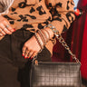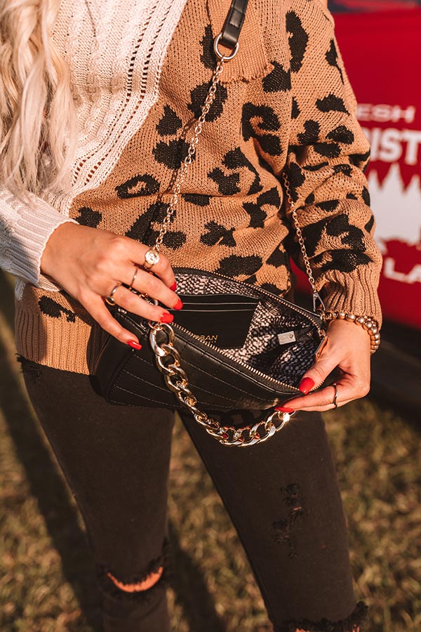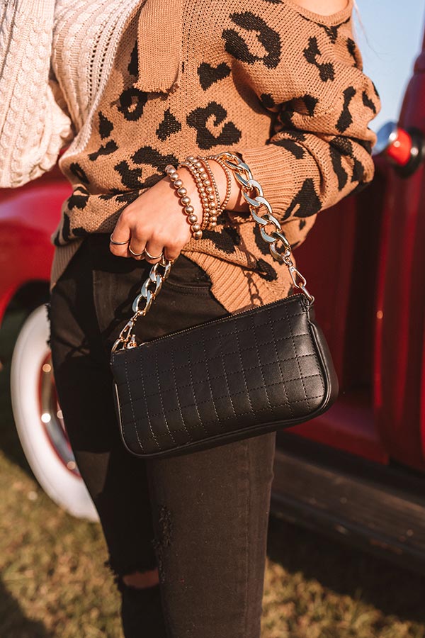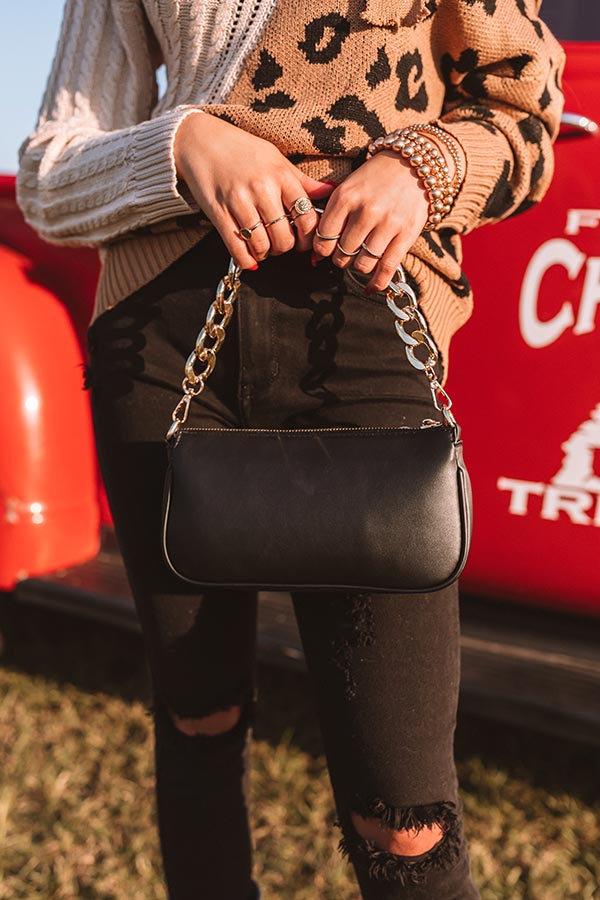 You won't find a better holiday accessory than our stunning black 'Hotel Suite Crossbody' featuring sleek faux leather material with grid texturing, a shorter oversized chain link handle, a removable and adjustable shoulder strap, and a spacious lightweight fully lined silhouette with a zip closure and additional inside pockets!