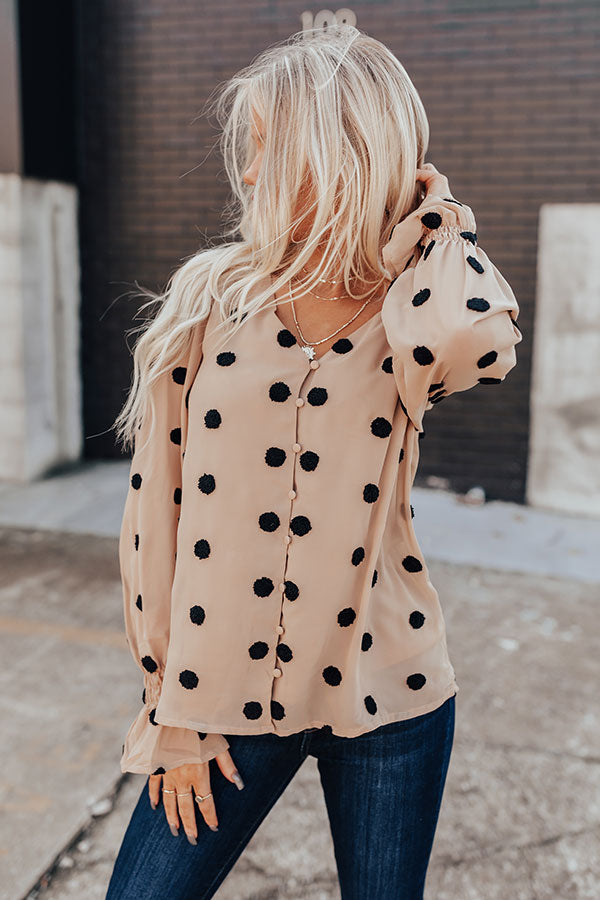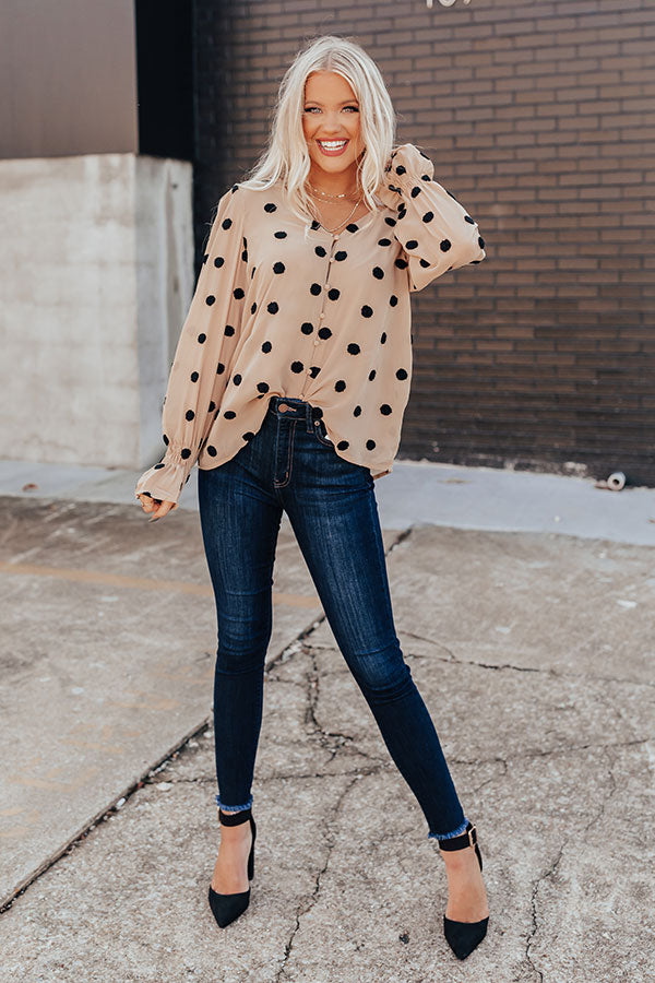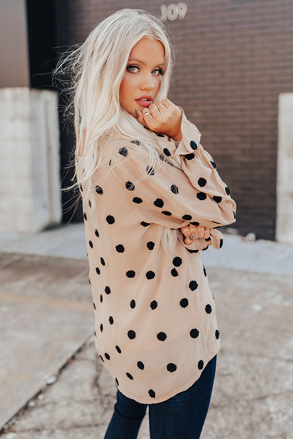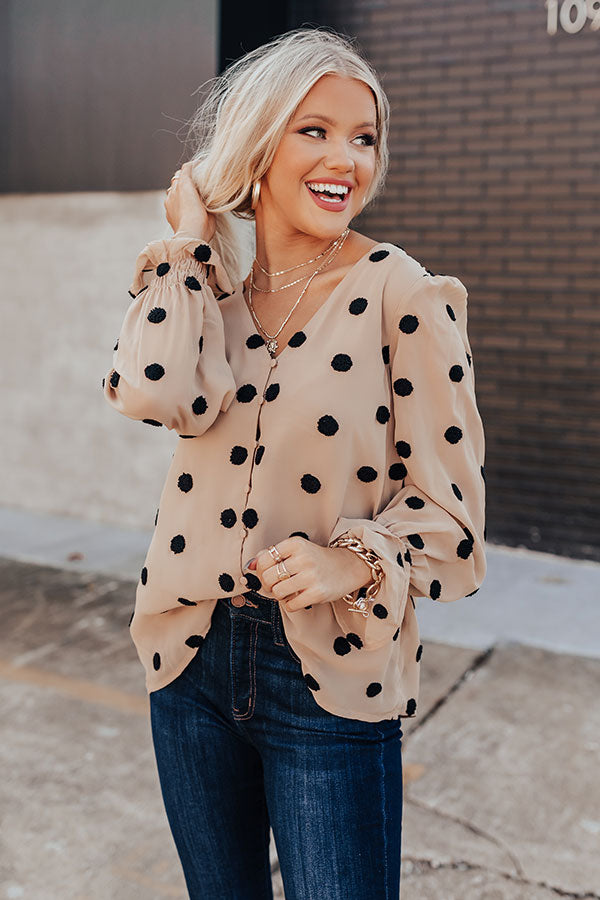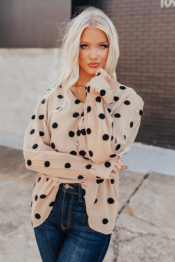 There is no better piece to take your from nine to wine than our neutral 'Hotel Suite' top featuring lightweight breezy material patterned with bold black polka dots, long bishop sleeves with flared smocked cuffs, a button down front with a v-cut neckline, and a shift silhouette that falls into a rounded hemline! Measurements