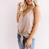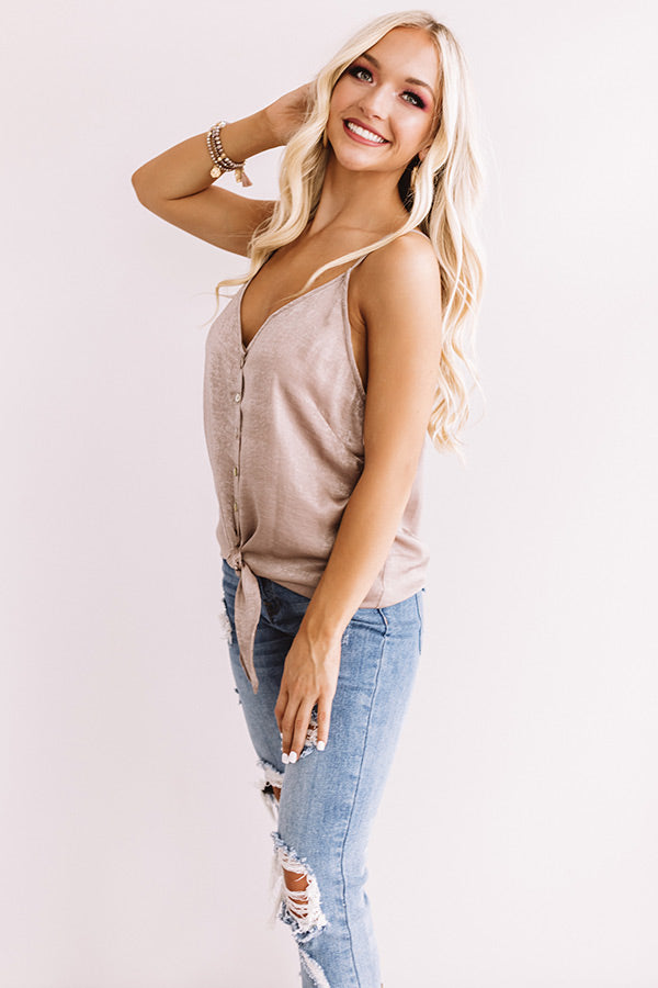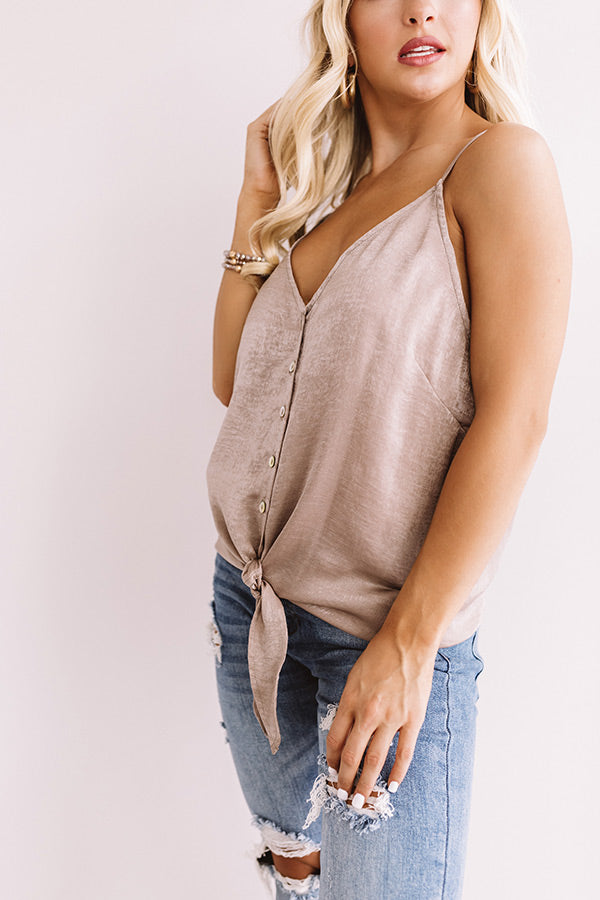 "How delightful" is this chic taupe tank featuring sleek satin material, spaghetti straps, a v-cut neckline, and a relaxed button up front bodice that falls into a knotted front hemline and straight back hem! This year round piece can be worn solo in the summer with some distressed ankle skinnies, or it can be dressed up for the fall by wearing it under a knit cardigan and front tucking it into our "Sweet Victory High Waist Corduroy Skirt in Rust" with "The Cadence Faux Suede Thigh High Boot," a faux suede hat, our "Dance Off Cheetah Clutch!" Measurements
