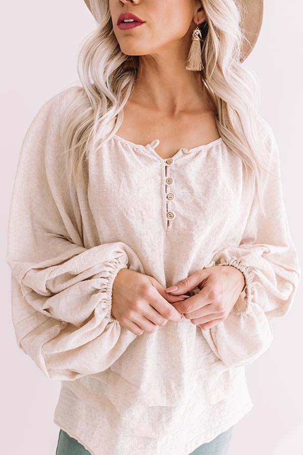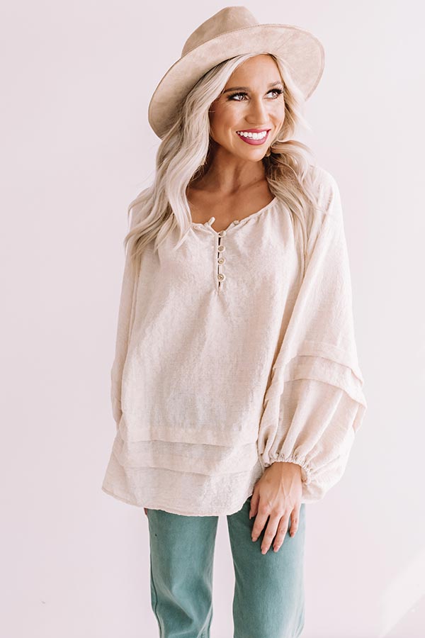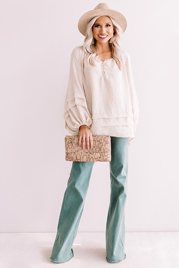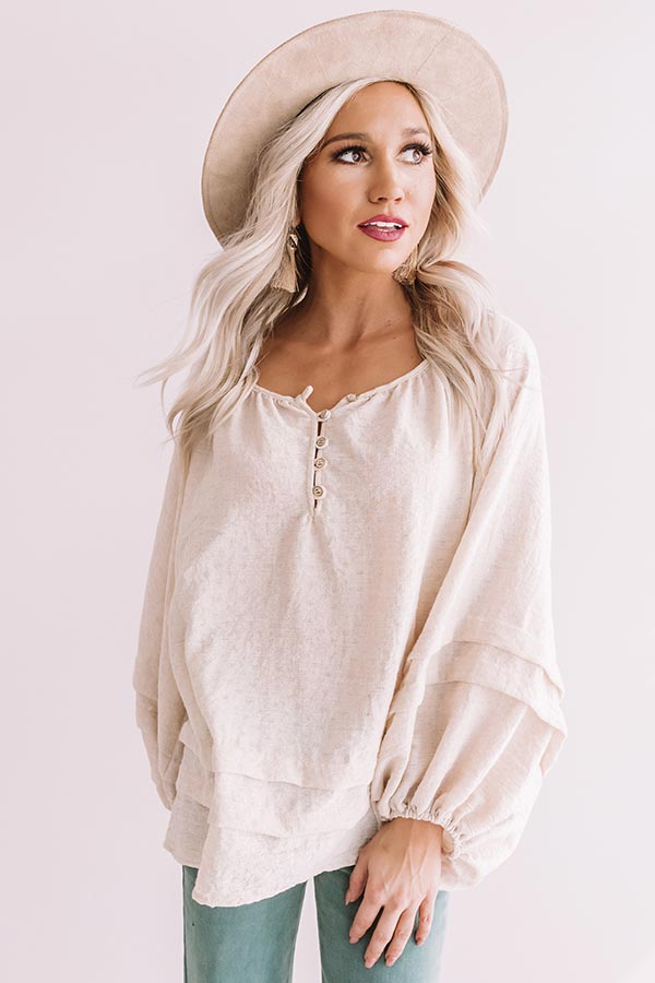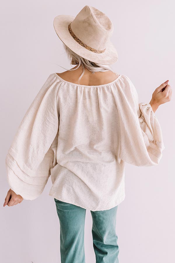 "How delightful" is this neutral hued shift top?!? It features lightweight material, a button up bodice with an off the shoulder fit neckline, long oversized bishop sleeves with fitted elastic banded cuffs, subtle ruffle detailing, and a relaxed silhouette that fall into a straight hemline! We have styled this beautiful basic with some colored flares, a snake print clutch, and a matching faux suede hat, but you can also wear it with our "Positive Vibes Faux Suede Skort in Taupe," "The Seraphina Faux Leather Wedge in Taupe," and our "Name Dropper Blanket Scarf in Dusty Purple!" Measurements