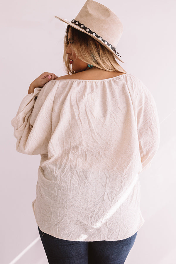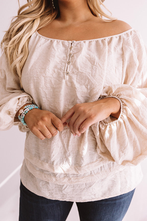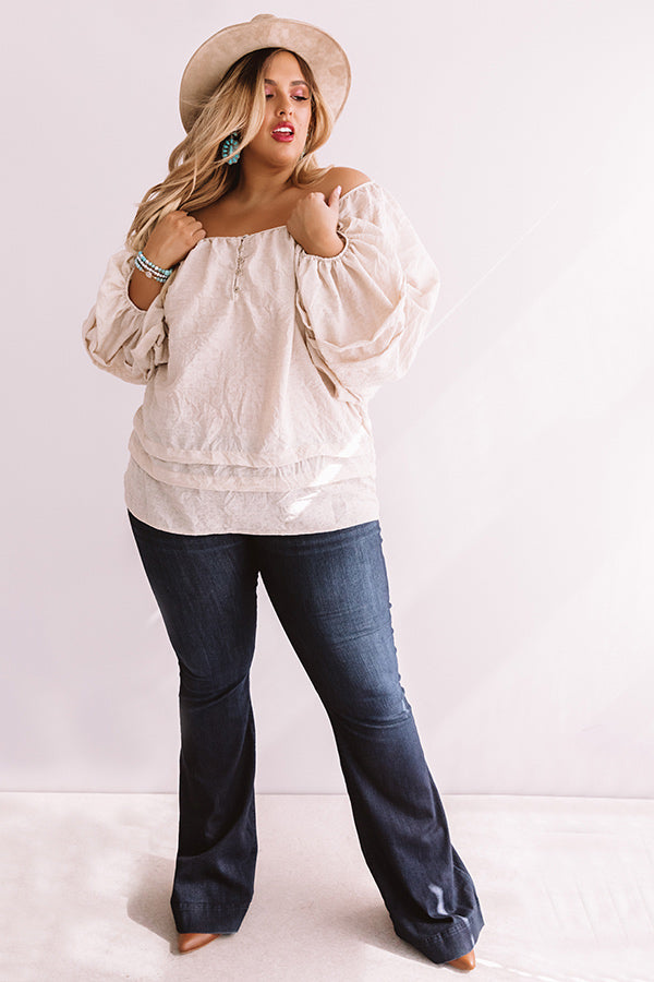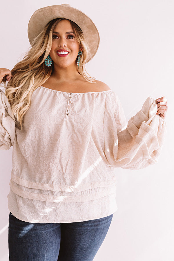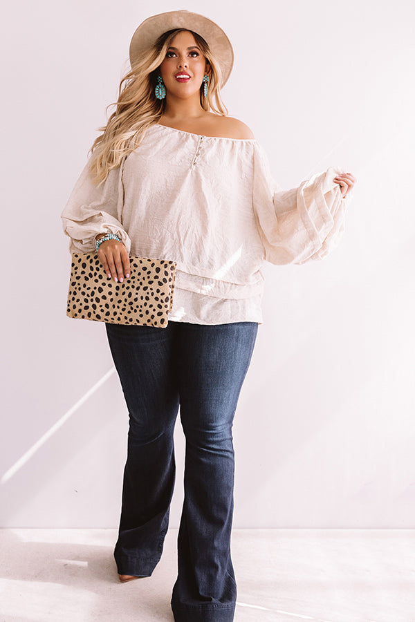 Plus Size - "How delightful" is this neutral hued shift top?!? It features lightweight material, a button up bodice with an off the shoulder fit neckline, long oversized bishop sleeves with fitted elastic banded cuffs, subtle ruffle detailing, and a relaxed silhouette that fall into a straight hemline! We have styled this beautiful basic with some dark wash flares, a leopard clutch, and a matching faux suede hat, but you can also wear it with our "Mademoiselle Faux Suede Skirt," "The Seraphina Faux Leather Wedge in Grey," and our "Name Dropper Blanket Scarf in Dusty Purple!" Measurements