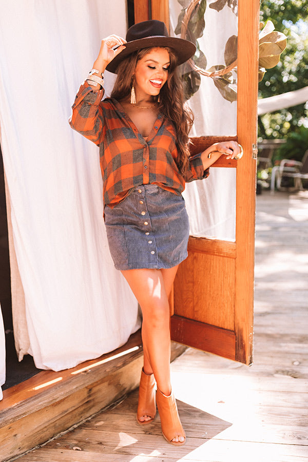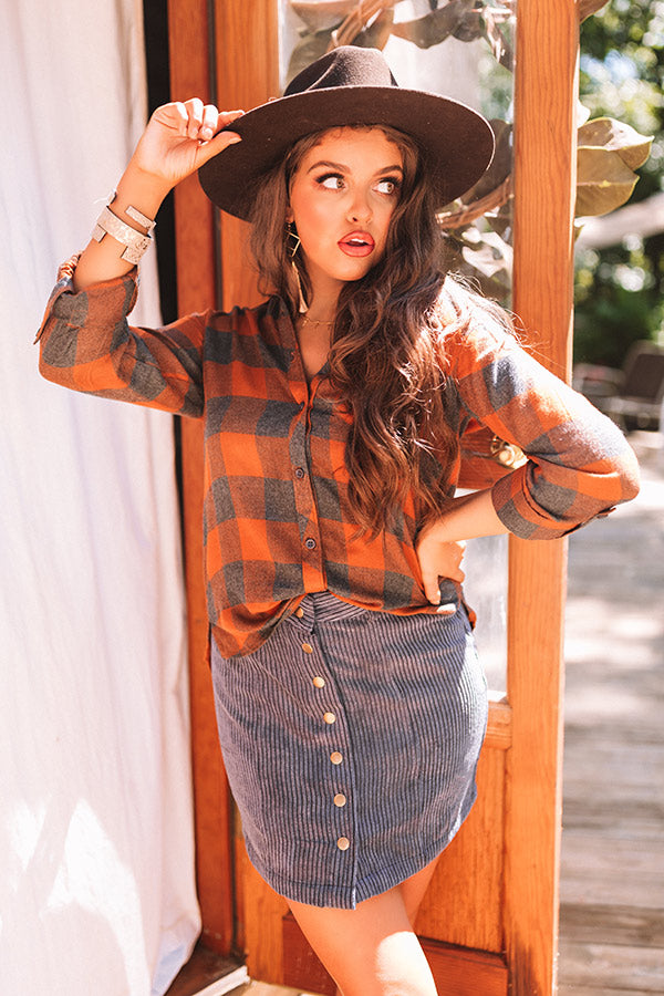 You are sure to look pretty in plaid when you wear our adorable "Hudson Valley" top featuring soft lightweight material patterned with a grey and pumpkin colored plaid print, a button down front with a collared v-cut neckline, long loose sleeves with roll tab button closure cuffs, a single accent chest pocket, and a relaxed silhouette that falls into a rounded hemline! We have styled this festive piece with a wool hat, a slate skirt, and matching peep toe wedged booties, but you can also wear it with some dark wash flares, "The Bali Platform Heel in Snake Print," and our "Your Biggest Fan Faux Leather Tote in Camel!" Measurements