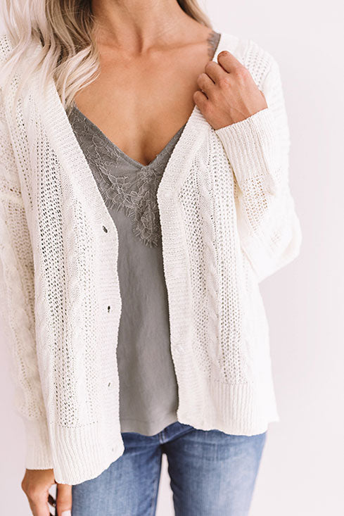 You will feel like your are wrapped in "hugs and kisses" when you wear this cream colored cardigan featuring a loose knit texture, a v-cut neckline, long sleeves with fitted cuffs, and an open front that can be buttoned up that falls into a straight ribbed hemline with side splits! You can style this versatile piece with just about anything from a basic tank to a sweater, jeans to dresses, wedges to sandals, clutches to totes, and hats to earrings! Here we have styled it over a simple grey tank with some distressed ankle skinnies, and a neutral peep toe bootie and backpack! Measurements