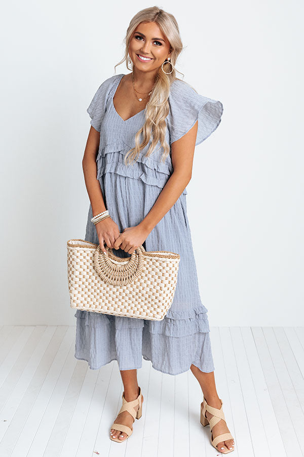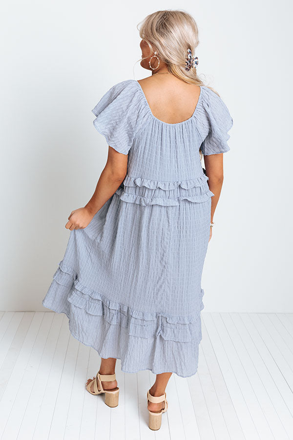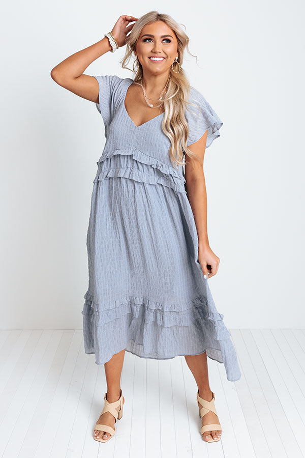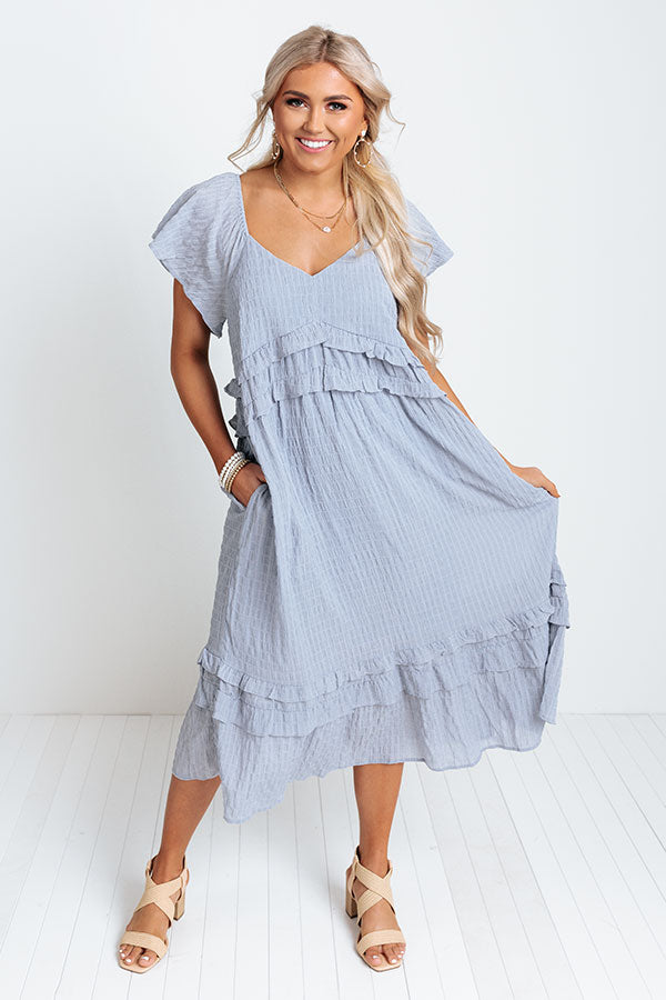 Dance to your own tune in our charming airy blue 'Humming Sweet Songs Midi' dress featuring lightweight and flowy seersucker material, a wide v-cut neckline and scooped upper back, flowy short sleeves, ruffle accent seams at the waistline, hidden side pockets, and an ultra relaxed skirt silhouette that cascades into an uneven mid-calf length hemline! Measurements