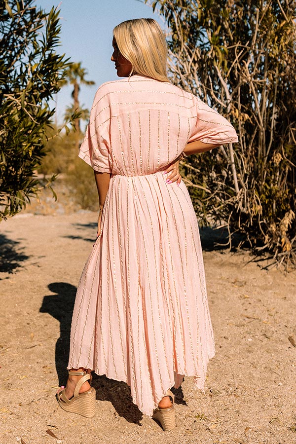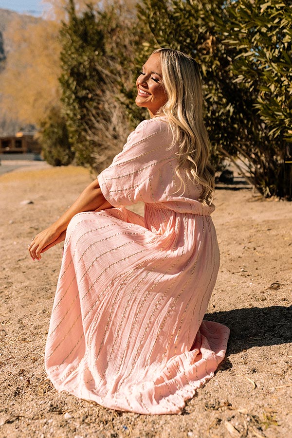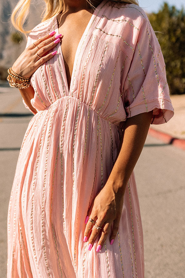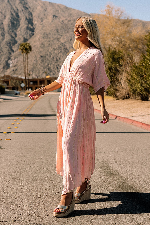 Spend your day at the beach in style with this pretty pink maxi dress featuring lightweight breezy material with subtle textured gold stripes, a deep v-cut neckline, oversized half sleeves, a cinched waistline, and a relaxed silhouette that cascades into an uneven ankle-length hemline!