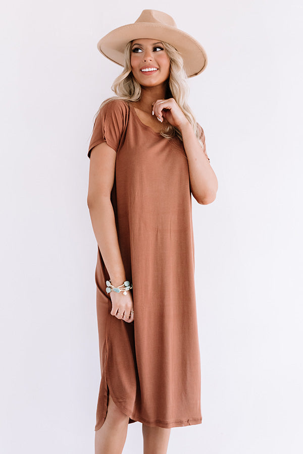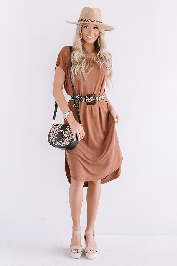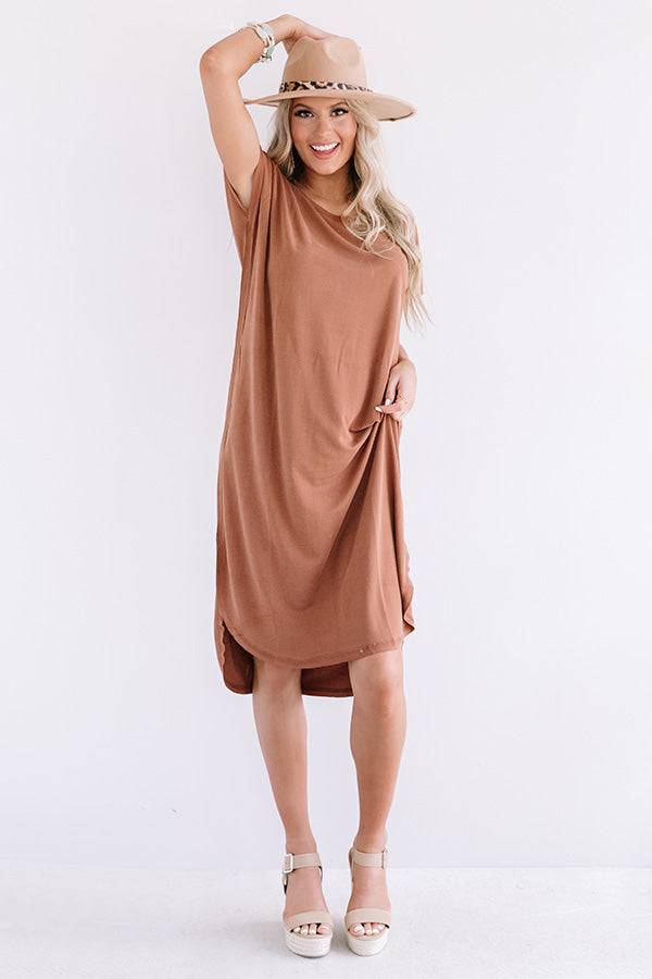 Arrive in style with our brown casual cute "Huntington Beach Happy Hour Midi" dress featuring soft lightweight material, a rounded neckline that can be worn off one shoulder, short loose sleeves, and an ultra relaxed silhouette that falls into a rounded mid-calf length hemline with side slits! You can style this year round basic with some neutral wedges and a leopard print statement belt, crossbody, and matching faux suede hat, but you can also wear it layered under a cropped jean jacket with our white "Steve Madden Alyse Bootie!" Measurements