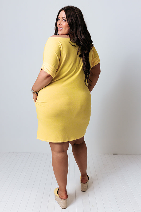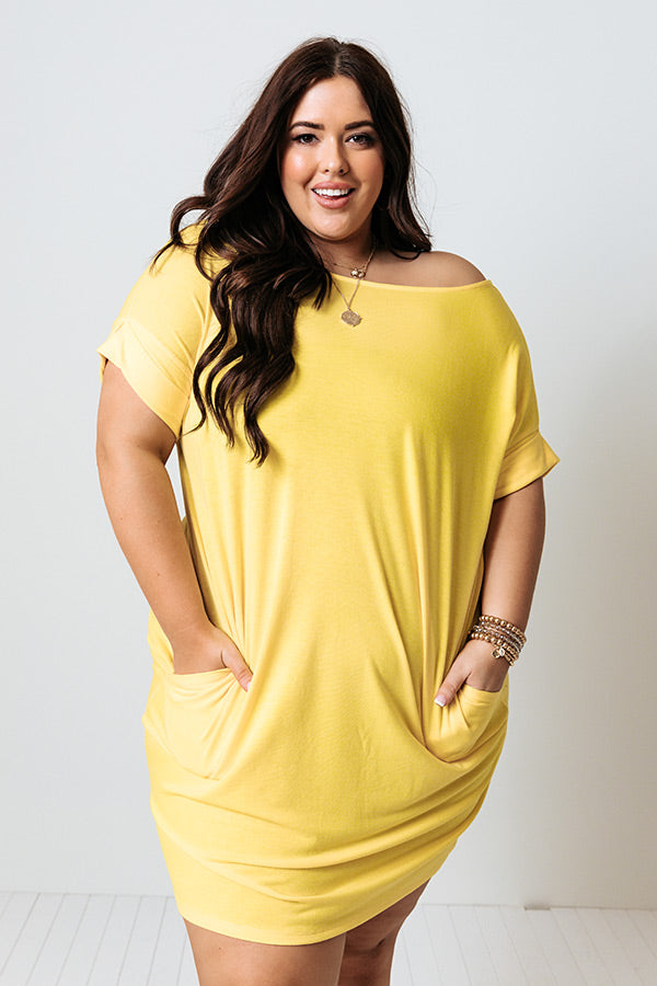 Plus Size - There is no better way to stay casual but cute than in this basic yellow t-shirt dress featuring soft lightweight material, a high rounded neckline, short loose sleeves with rolled cuffs, accent side pockets, and a slouched silhouetted that ends in a straight mid-thigh length hemline! Measurements