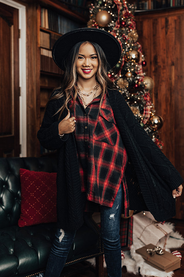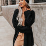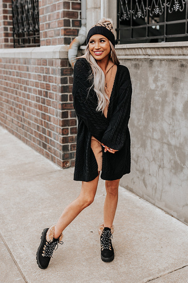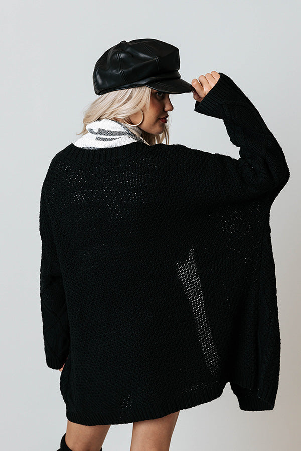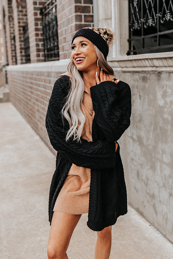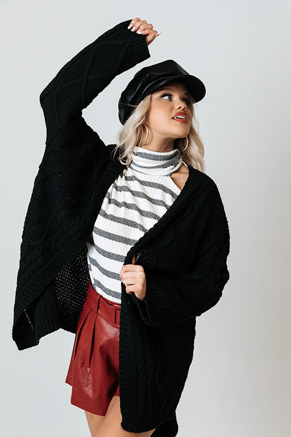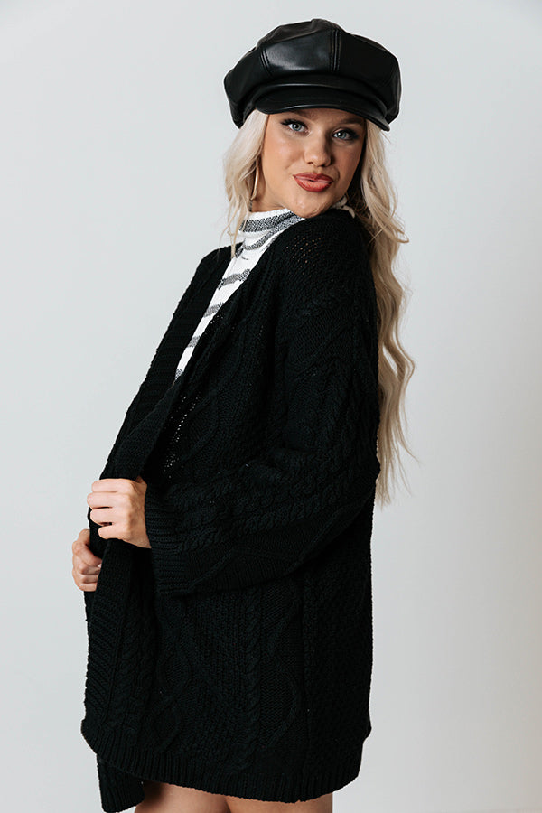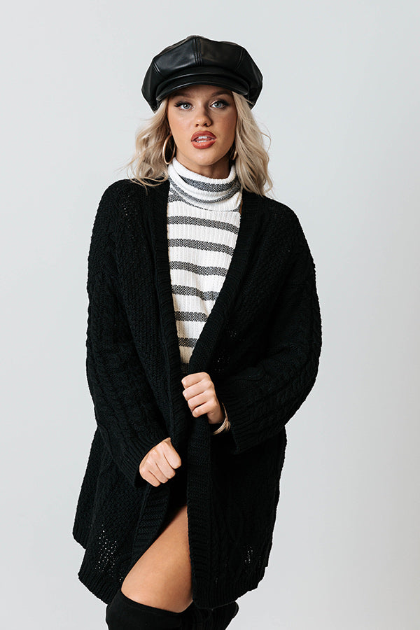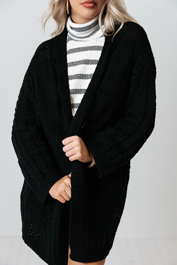 Keep warm all fall long in our adorable black 'Iced Coffee Life' cardigan featuring soft and warm cable knit material, long loose sleeves, and an ultra draped open front silhouette that falls into a straight lower-thigh length hemline!