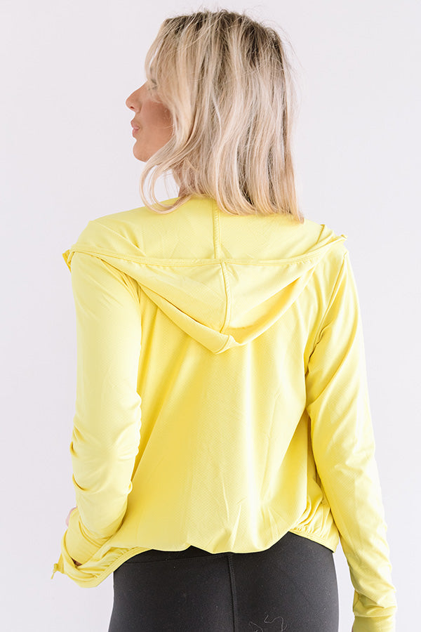 Stay looking stylish on your "iced coffee run" with our sporty yellow active jacket featuring lightweight stretchy material, a zip closure front with a hooded back, long form fitting sleeves with accent thumb holes, accent side pockets, and a figure flattering silhouette that falls into a straight hemline! You can style this versatile piece over any athleisure set with trendy sneakers for the perfect workout or errand running look! Measurements