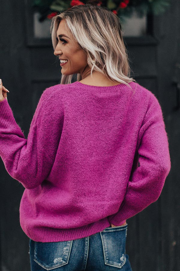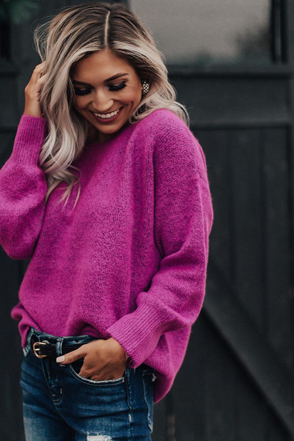 This adorable purple hued piece is the "icing on top" of your already amazing cold weather wardrobe with its soft lightweight tight knit material with fuzzy texturing, ribbed trim detailing, a high rounded neckline, long loose sleeves with fitted cuffs, and a relaxed silhouette that falls into a straight hemline! You can style this vibrant piece a variety of ways, like with some distressed ankle skinnies, a black and white plaid scarf, and black booties, or you can wear it with some charcoal flares, "The Seraphina Faux Leather Wedge in Grey," and our "All Caught Up Headband in Grey!" Measurements