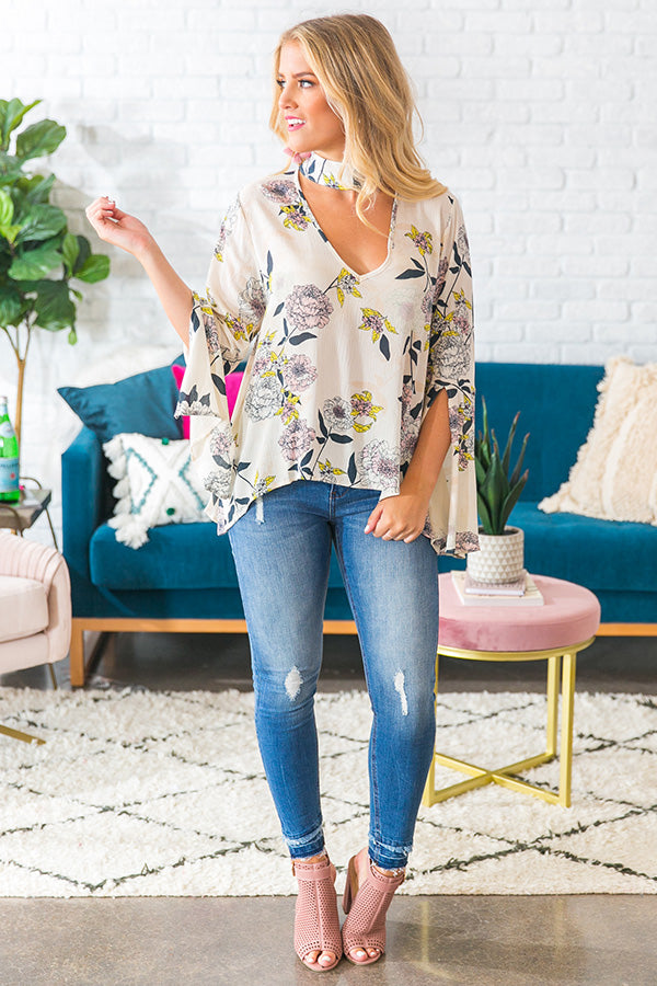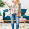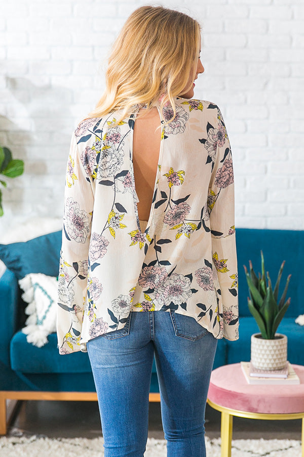 Stop and stare at this floral gem! The collared 'V' neckline is featured in the front and the back. The back collar features two matching exterior buttons to clasp it together. Each arm has slits to show off your favorite jewelry in this faux-long sleeved beauty! Measurements