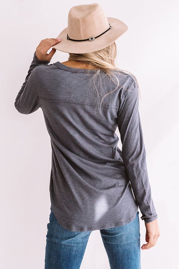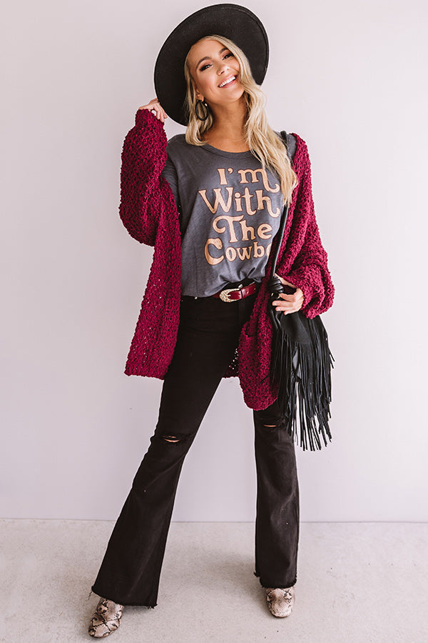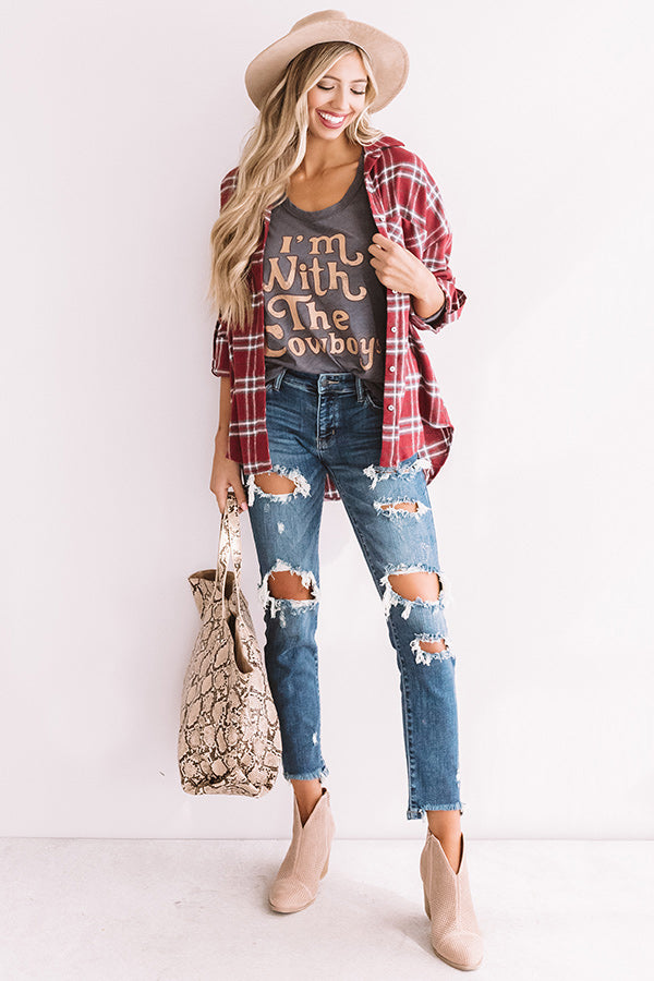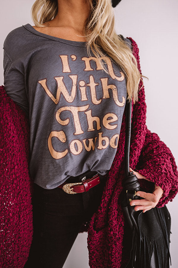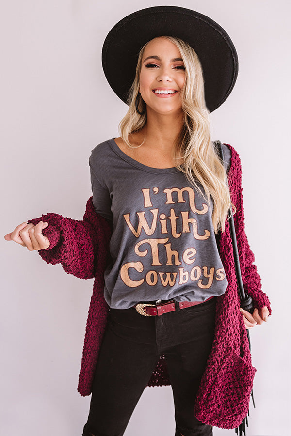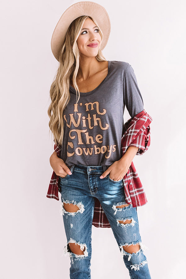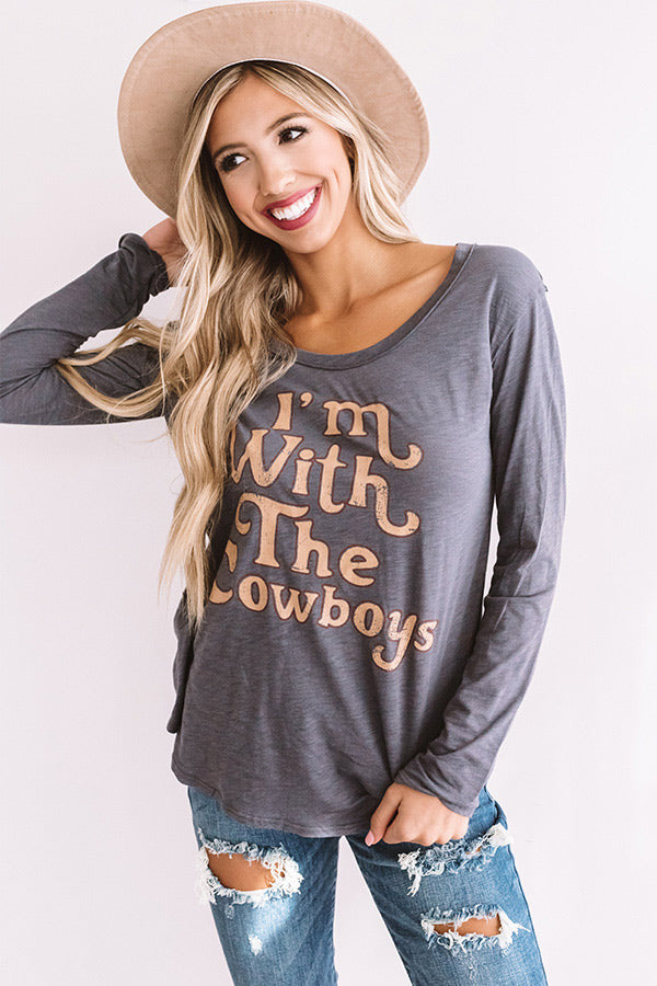 Keep your fall style causal with this charcoal colored shift tee featuring stretchy lightweight material, a wide rounded neckline that can be worn off one shoulder, long loose sleeves, an neutral hued "I'm With The Cowboys" font graphic on the front, and a relaxed silhouette that falls into a straight hemline! You can dress this piece up by styling it with some distressed ankle skinnies, a snake print tote, and a neutral tote and faux suede hat, or you can dress it down by wearing it with "The Bombshell Joggers" and "The Delaney Sneaker in Gold!" Measurements