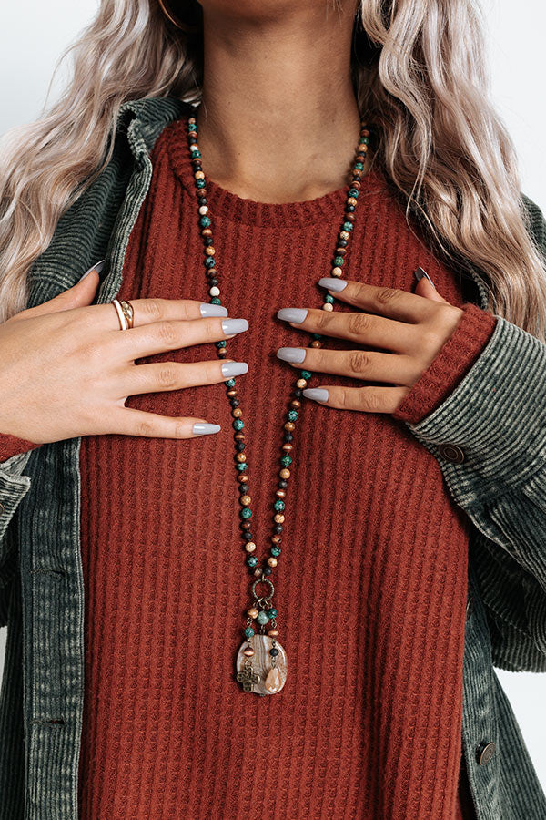 Wow the crowd with our 'I'm Yours' necklace featuring a long turquoise and natural beaded chain with a large semi precious stone pendant! Due to the natural stone there may be some variations in color, shape or size.