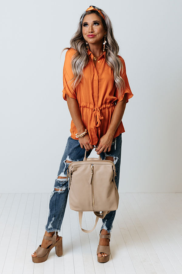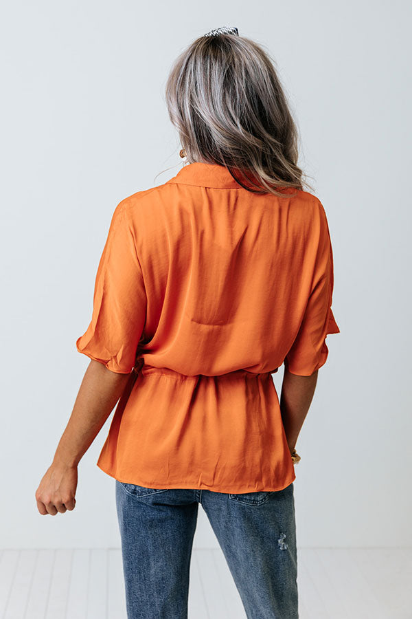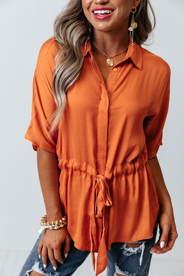 Slay all day in our chic tangerine colored 'Imported Bubbly' top featuring lightweight satin material, a button down front with a v-cut collared neckline, a cinched waistline with a tie belt closure, short loose sleeves, and a flattering silhouette that ends in a straight hemline! Measurements