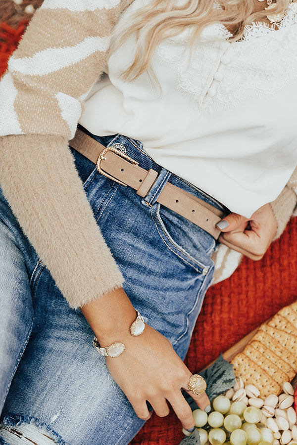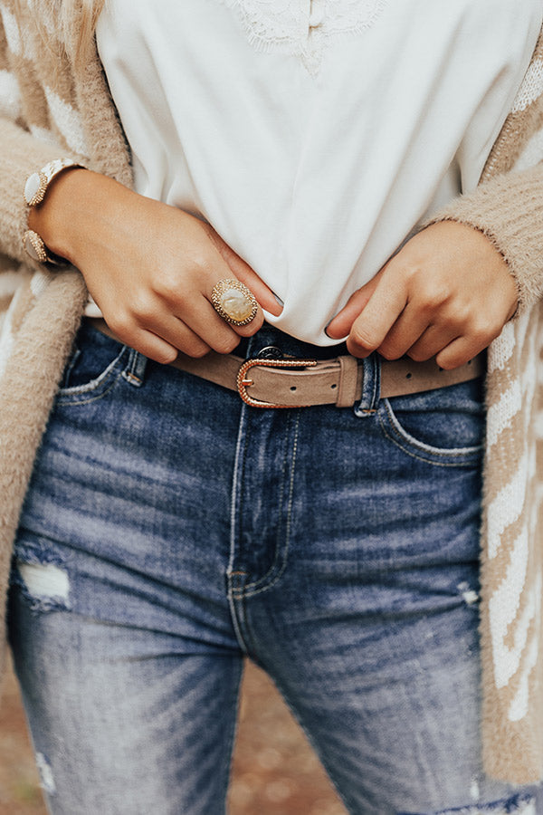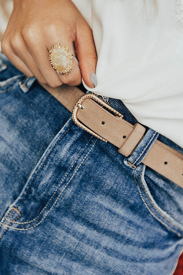Add an impressive touch to any look with this simple but stylish belt featuring a taupe hued strap with a minimalist gold buckle! Belt Range: 29.5in-37.5in