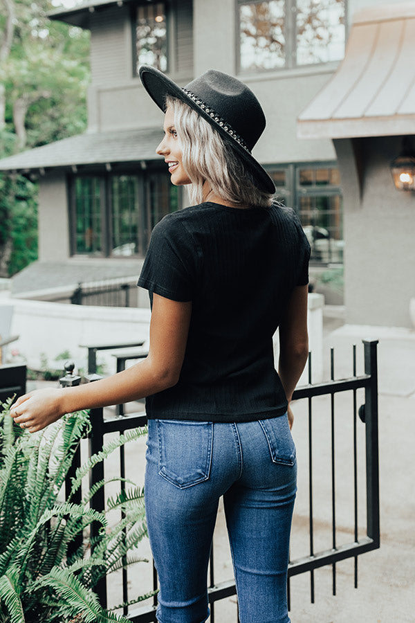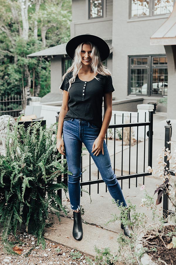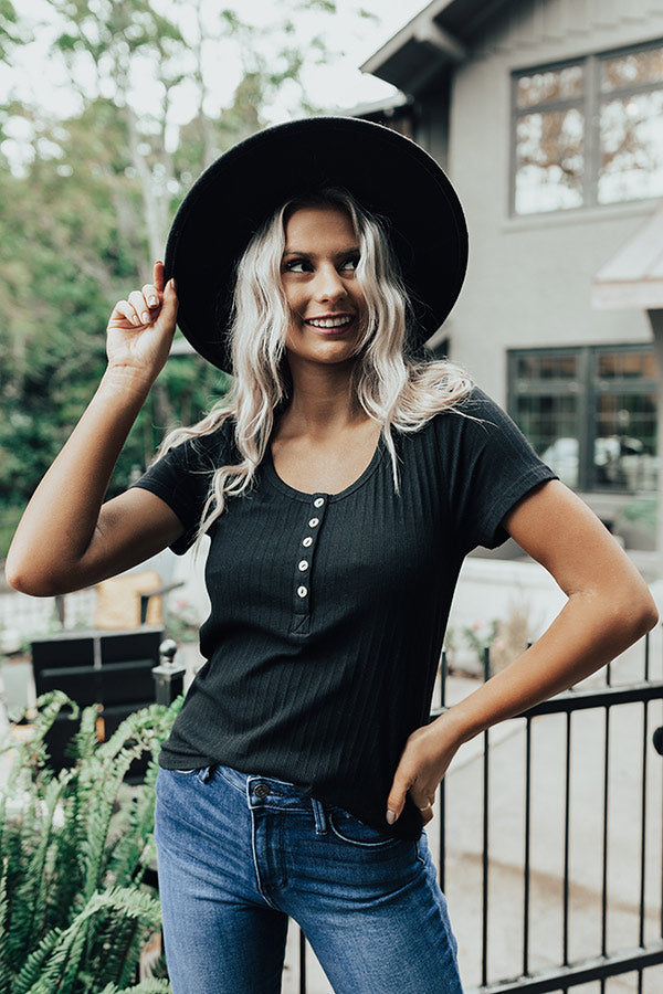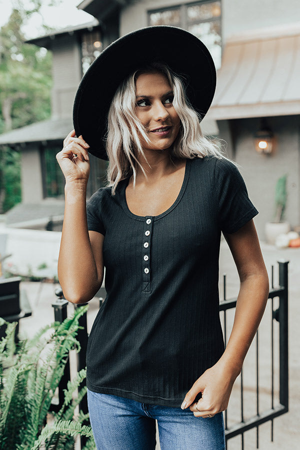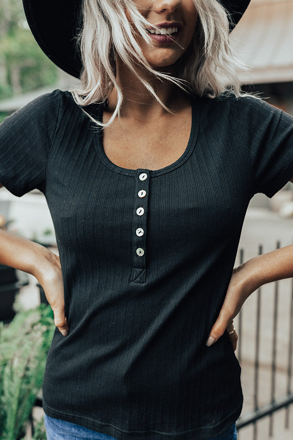 Complete your look with an impressive touch with this casual black top featuring lightweight material with ribbed texturing, a button up bodice with a scooped neckline, short sleeve, and a relaxed silhouette that falls into a straight hemline!