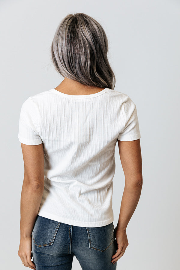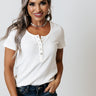 Complete your look with an impressive touch with this casual ivory top featuring lightweight material with ribbed texturing, a button up bodice with a scooped neckline, short sleeve, and a relaxed silhouette that falls into a straight hemline! Measurements