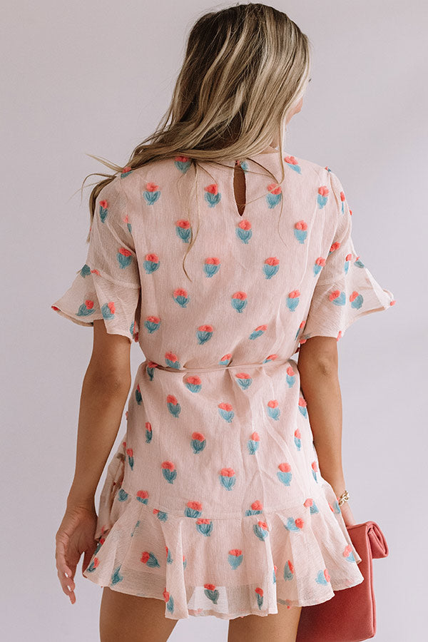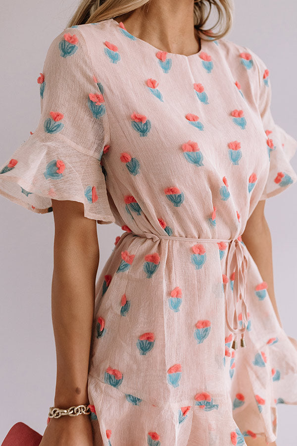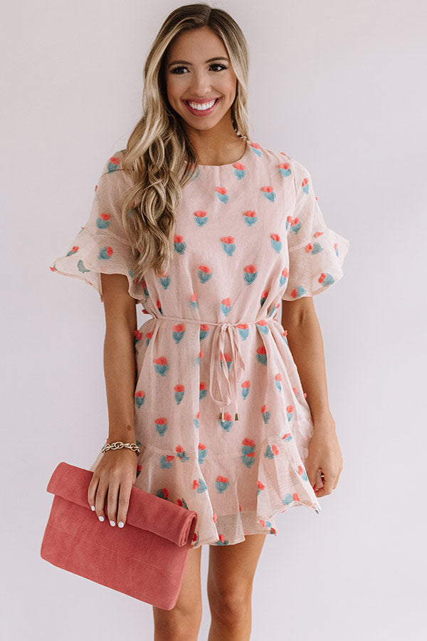 Spring is sure to be in full bloom when you wear this adorable neutral hued shift dress featuring lightweight material patterned with a large red and blue hued embellished floral print, a high rounded neckline, short loose sleeves with oversized flared cuffs, a tie string belt, a keyhole accented back with a button closure, and a relaxed silhouette that falls into an mid-thigh length peplum hemline! We have styled this cutie with a neutral heel and pink clutch, but you can also wear it with "The Mary Kate Faux Suede Heel in Light Turquoise!" Measurements
