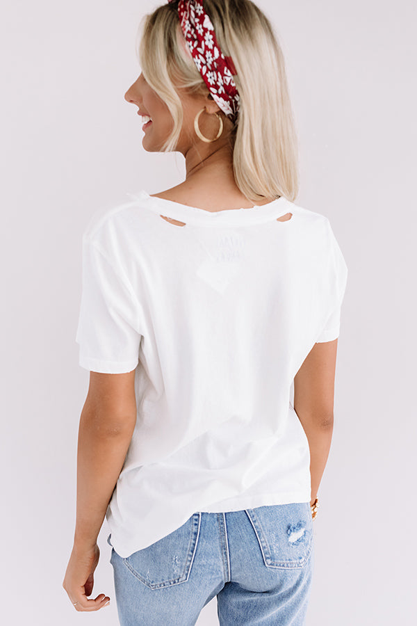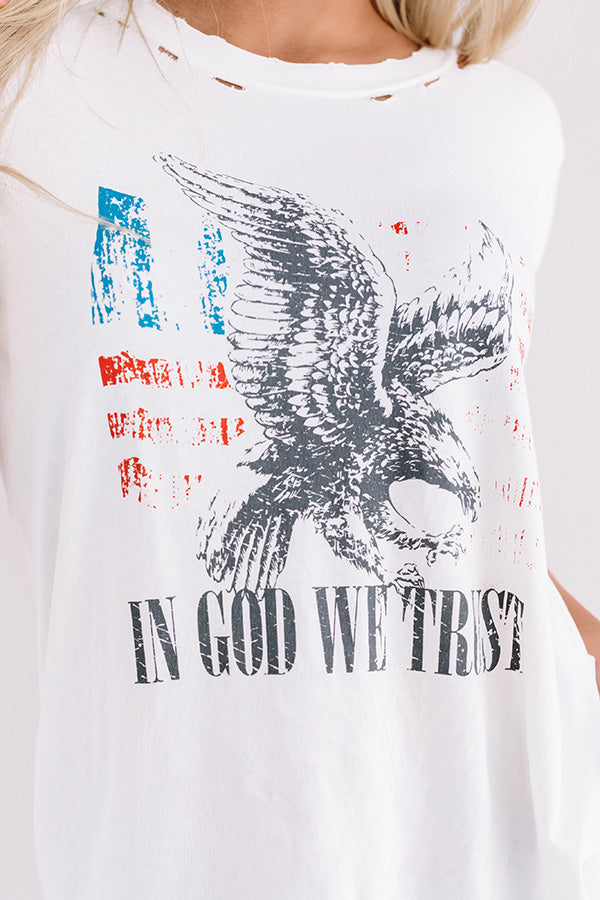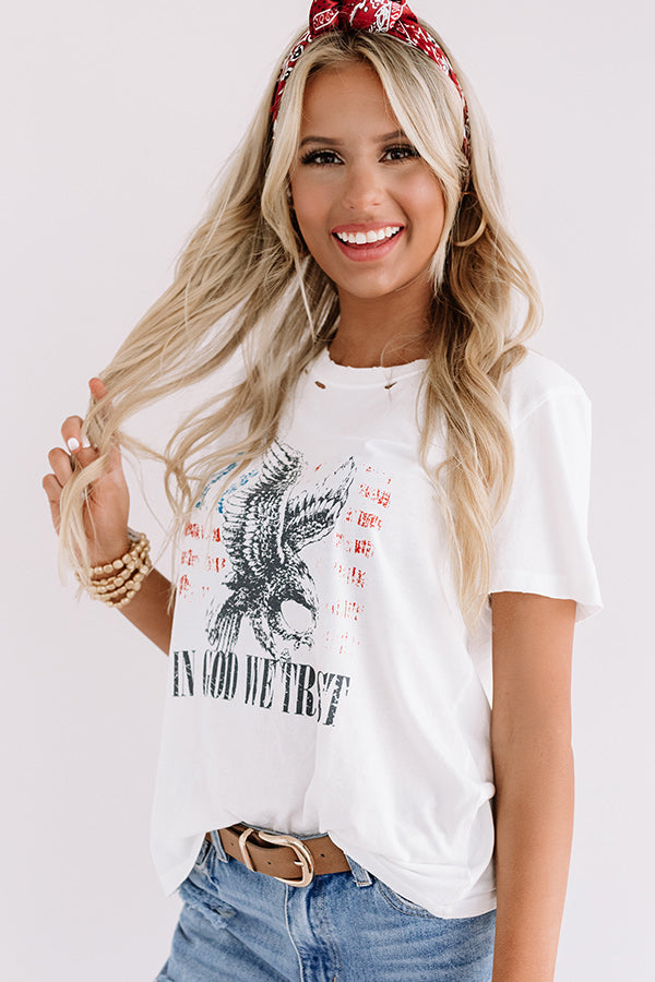 Make a statement in our casual white "In God We Trust Tee" featuring soft lightweight material with block lettering, an American flag, and eagle graphic on the front, a high rounded neckline with subtle distressed detailing, short loose sleeves, and a relaxed silhouette that falls into a straight hemline! We have styled this cutie with some distressed ankle skinnies, a matching hair scarf, a brown statement belt, and some trendy sneakers, but you can also wear it with some frayed white shorts, "The Alba Wedge in Navy," and our "Bryant Park Views Quilted Crossbody in Red!" Measurements