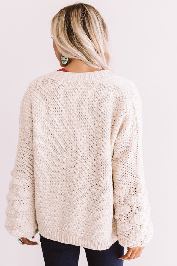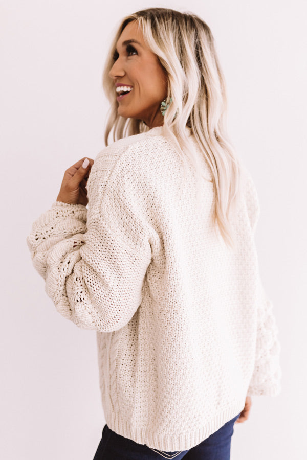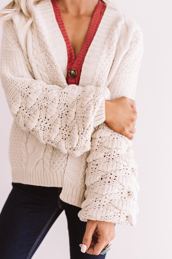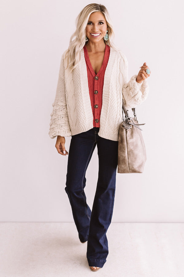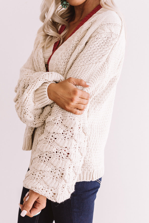 Treat yourself to this stone colored cardigan "in the KNIT of" time for fall with its warm loose knit material, oversized bishop sleeves with fitted cuffs and a large bubble texture, straight hemline, and an open front silhouette with ribbed trim! You can style this versatile piece with just about anything from a basic tank to a sweater, jeans to dresses, wedges to sandals, clutches to totes, and hats to earrings! Measurements