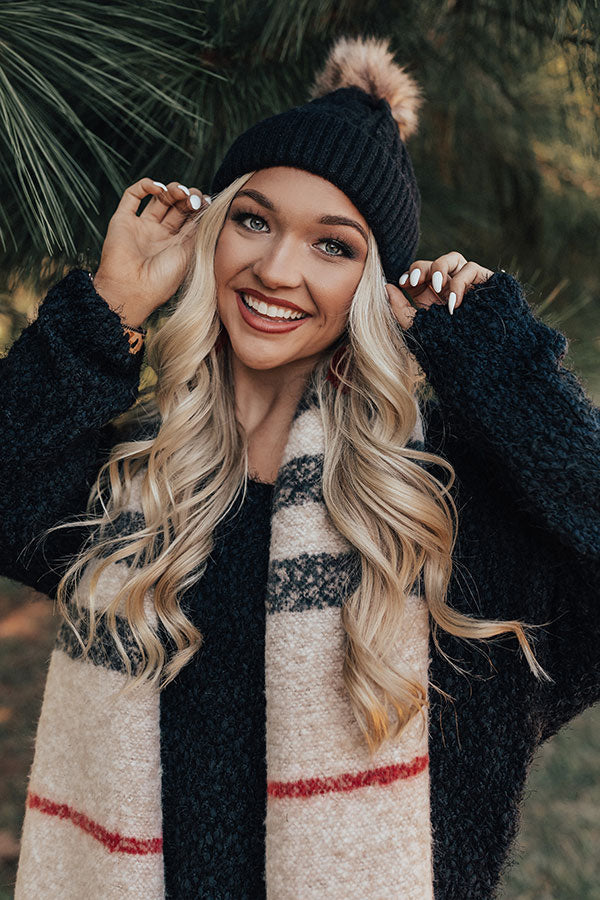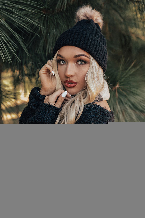 You are sure to be "in the know" about all this years fall trends when you top of your OOTD with this black beanie featuring soft stretchy loose knit material with wide texturing, a faux fur pom accent, and a rolled hemline!