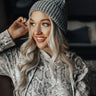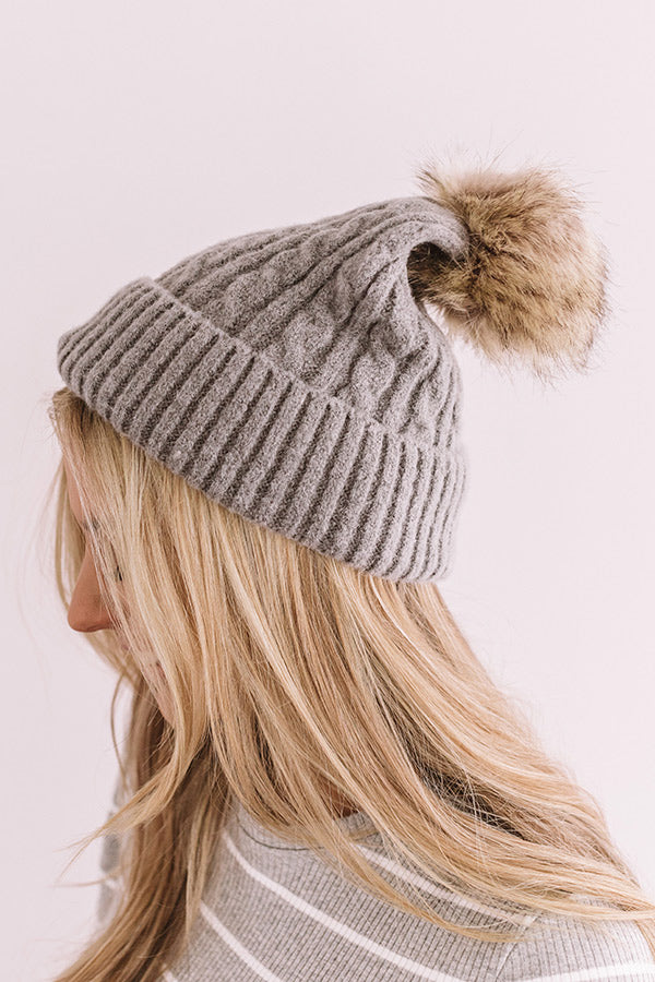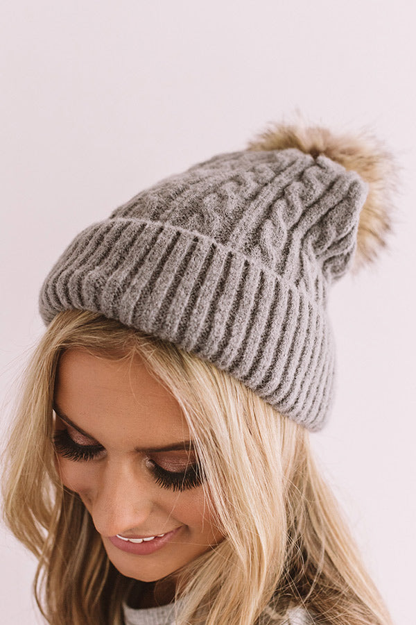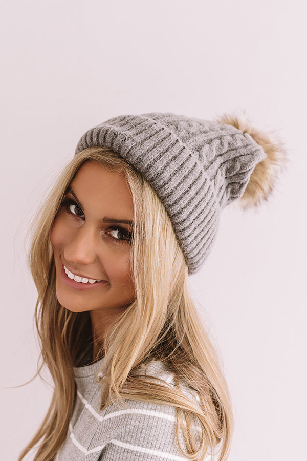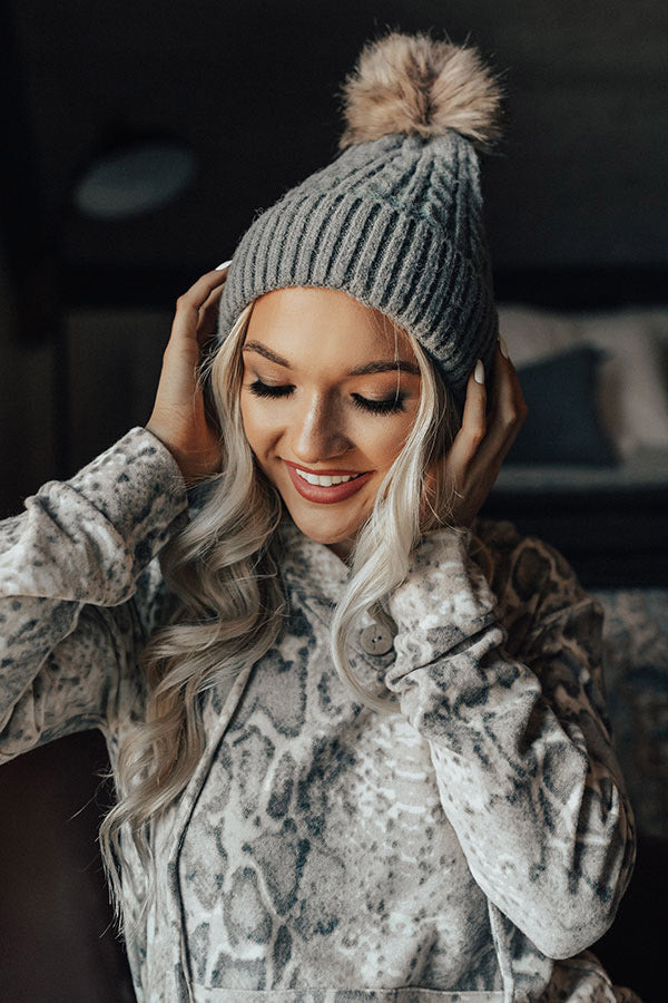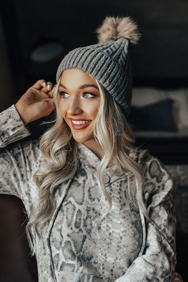 You are sure to be "in the know" about all this years fall trends when you top of your OOTD with this dark grey beanie featuring soft stretchy loose knit material with wide texturing, a faux fur pom accent, and a rolled hemline!