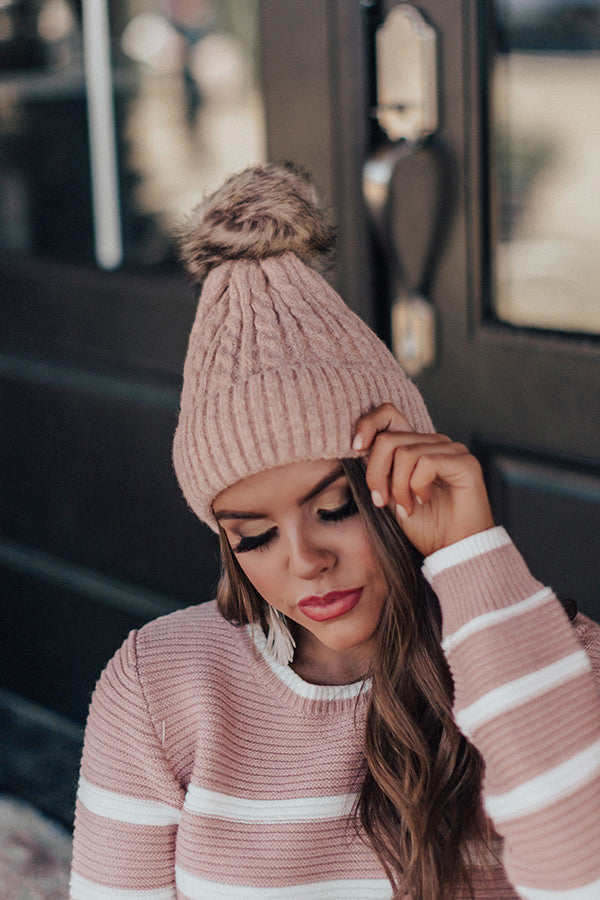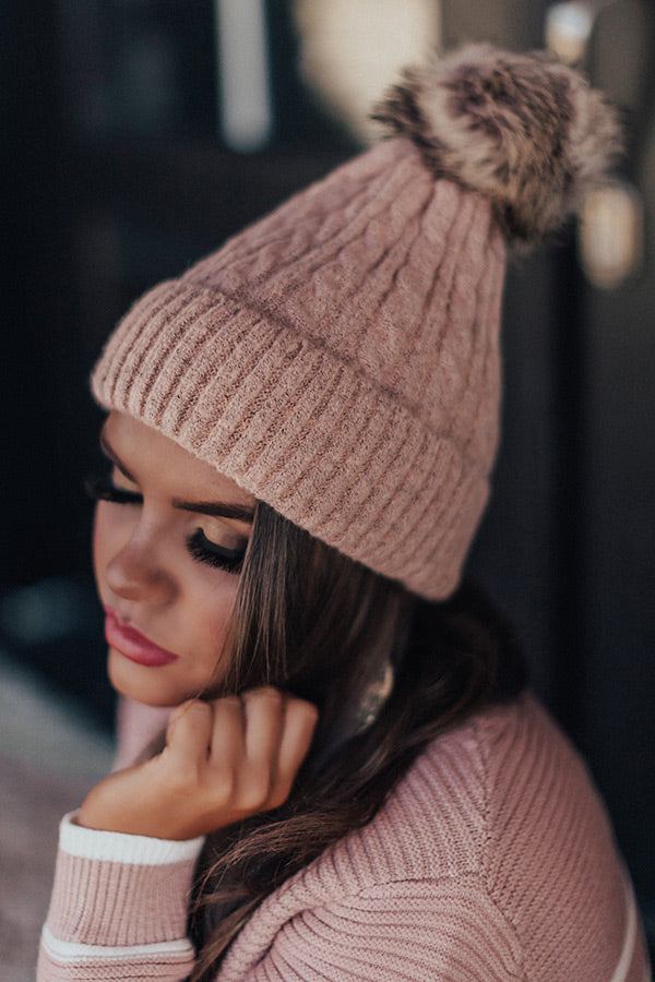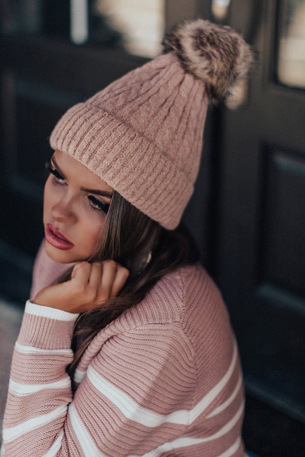 You are sure to be "in the know" about all this years fall trends when you top of your OOTD with this latte colored beanie featuring soft stretchy loose knit material with wide texturing, a faux fur pom accent, and a rolled hemline!