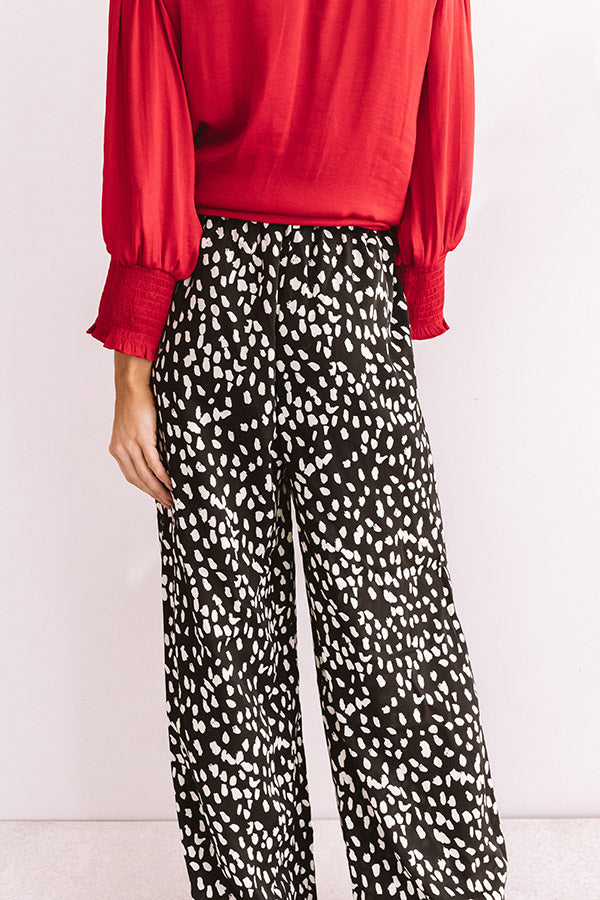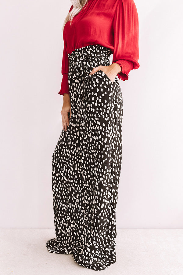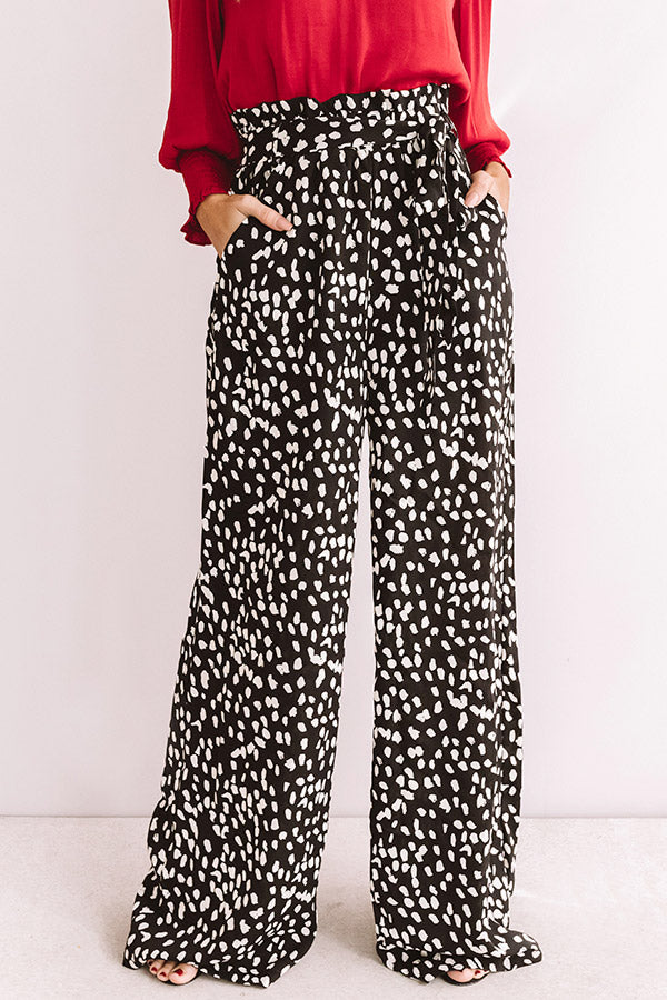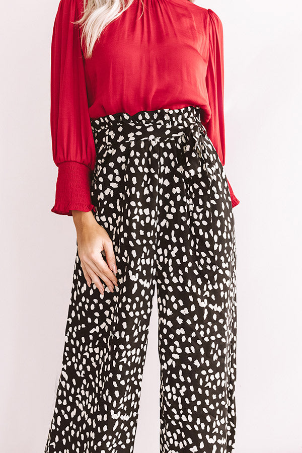 Our black "In The Lap Of Luxury" pants are for all your girl bosses out there slaying with their sleek lightweight material with a spotted white pattern, a high waist fit with ruffle trim, belt loops with a tie ribbon belt, hidden side pockets, and an ultra breezy silhouette that falls into straight floor length hemlines! We have styled this piece for the working girl with an elegant blouse and peep toe heels, but you can also style it with a tucked in white tank, our "In The Limelight Blazer," a black tote, and "The Brinkley Heel!" Measurements