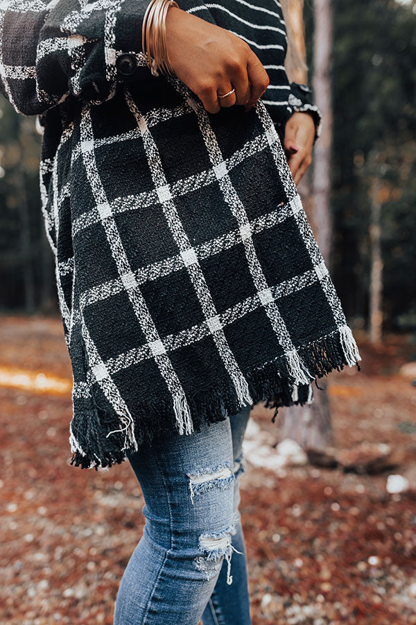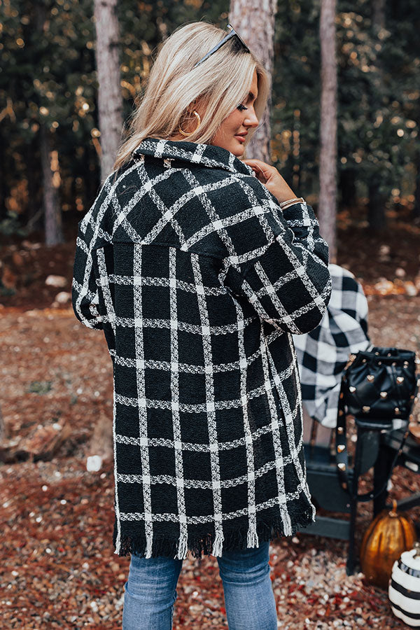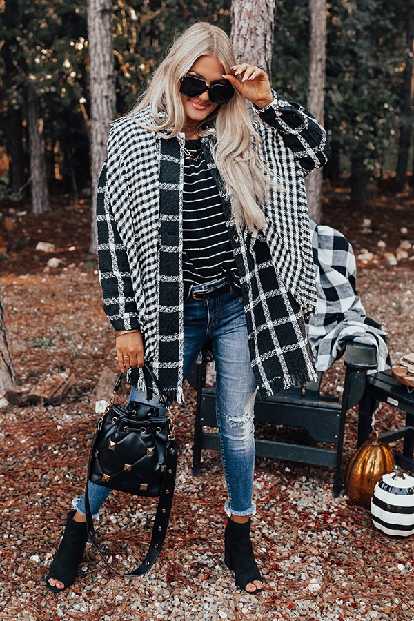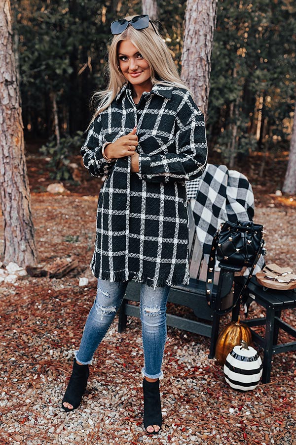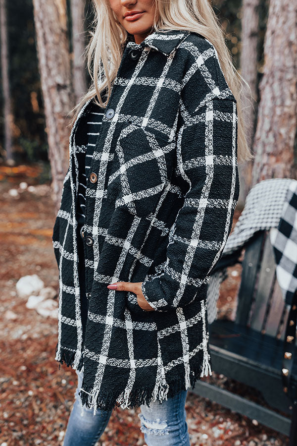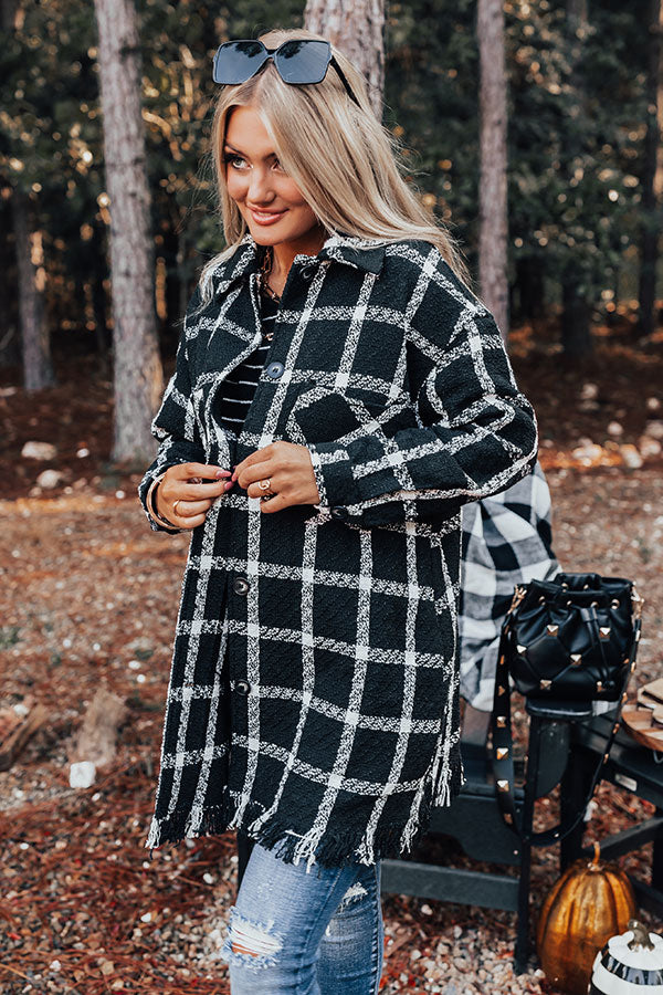 Layer up luxuriously in our chic black 'In The Now' coat featuring lightweight but warm material patterned with a white plaid print, a button down front with a collared neckline, long loose sleeves with button closure cuffs, two accent chest pockets and two hidden side pockets, and a relaxed silhouette that falls into a straight mid-thigh length hemline with frayed trim detailing!