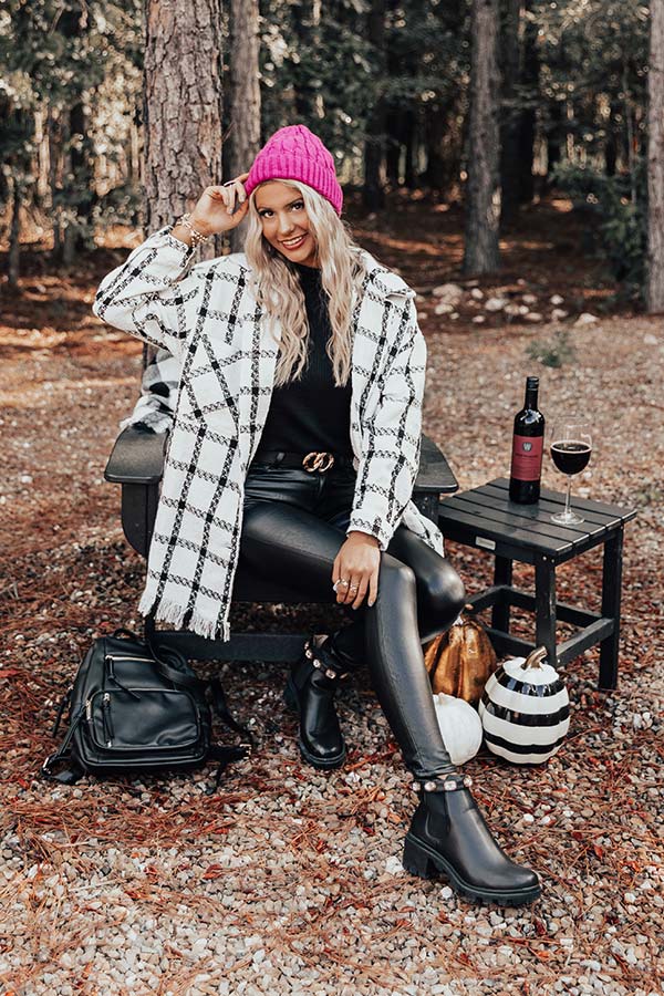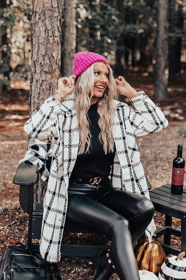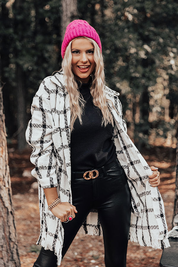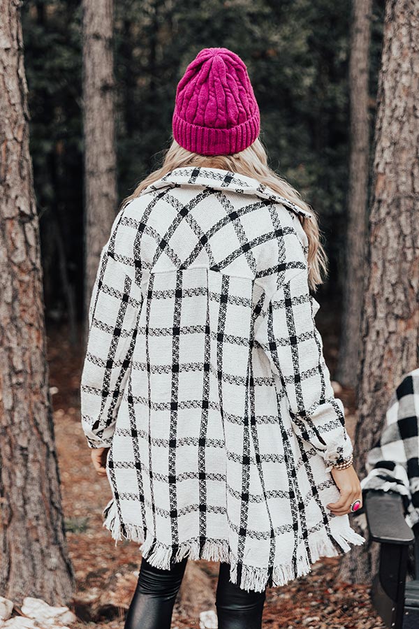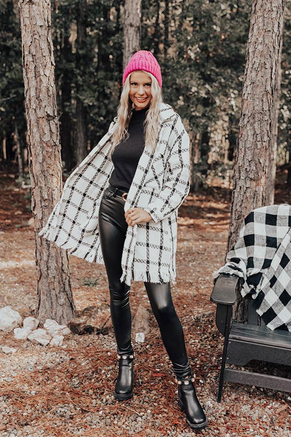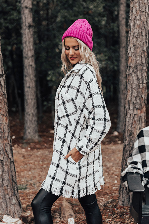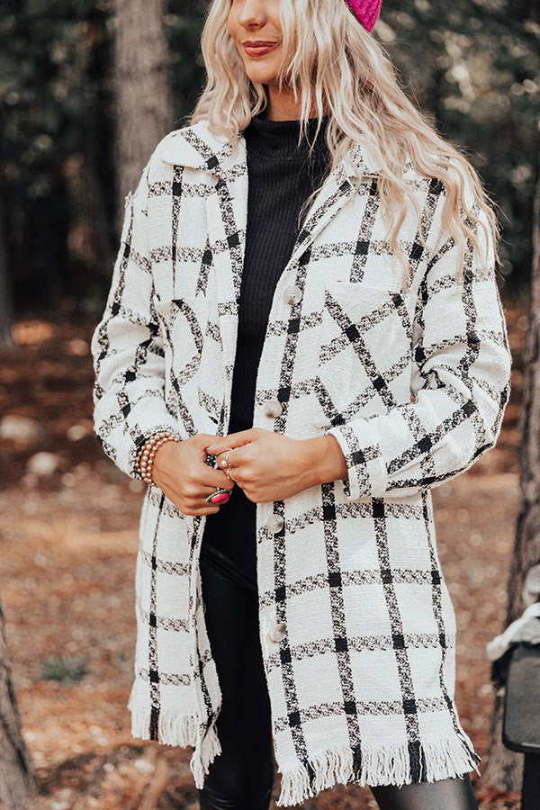 Layer up luxuriously in our chic white 'In The Now' coat featuring lightweight but warm material patterned with a black plaid print, a button down front with a collared neckline, long loose sleeves with button closure cuffs, two accent chest pockets and two hidden side pockets, and a relaxed silhouette that falls into a straight mid-thigh length hemline with frayed trim detailing!