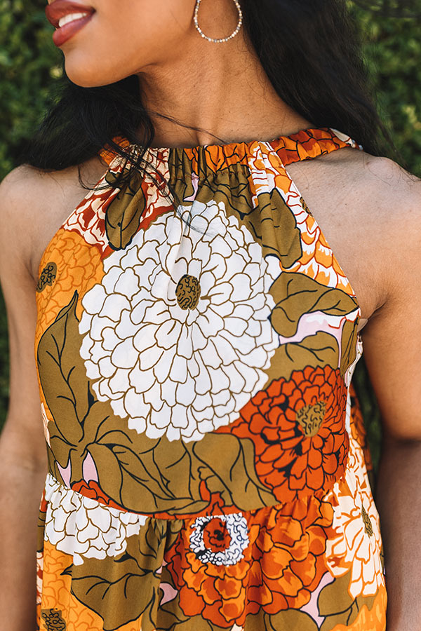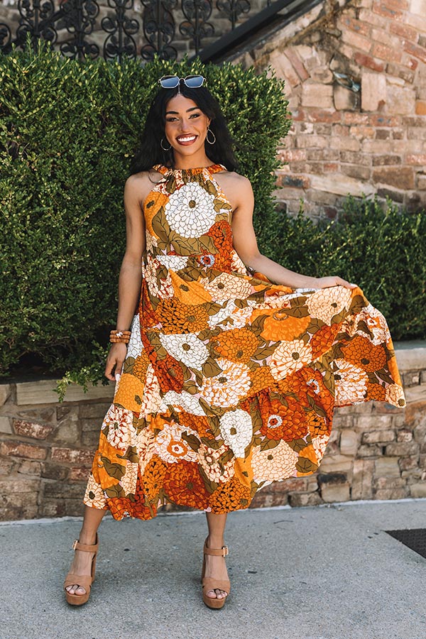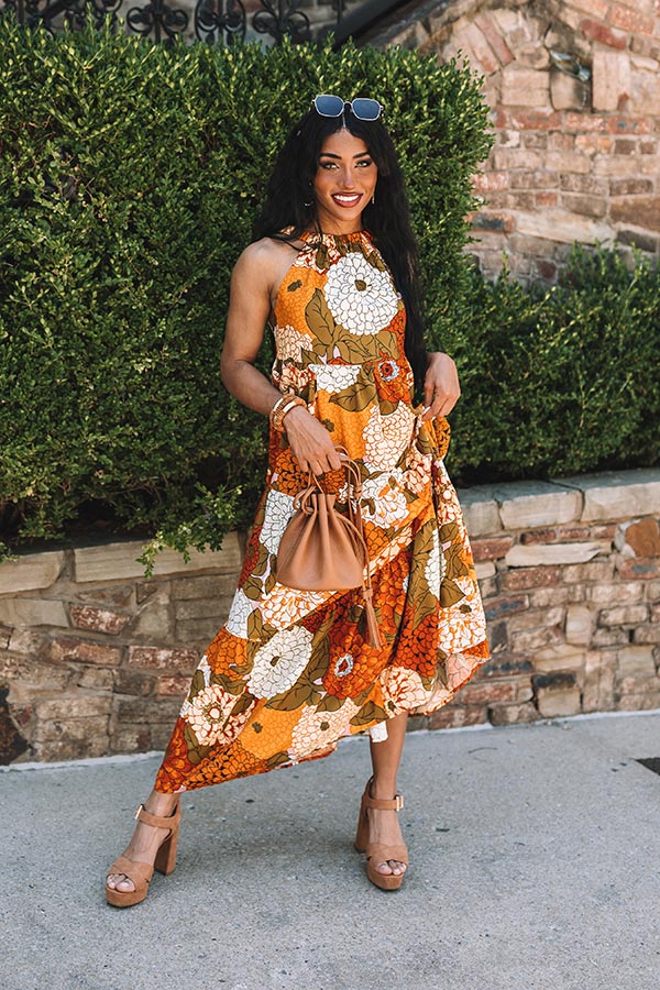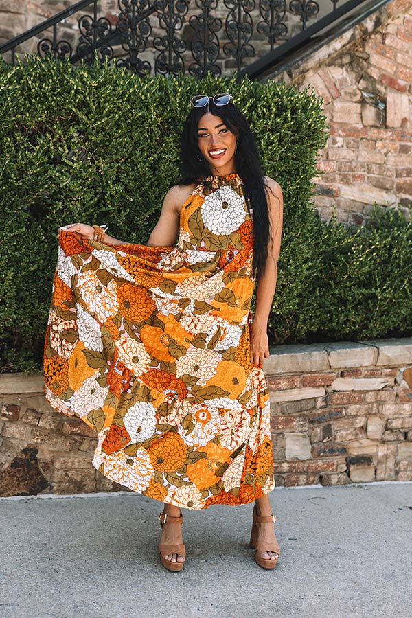 Arrive in style in our beautiful dark olive hued 'In This Together' maxi dress featuring lightweight material patterned with a large white, dark rust, and orange hued floral print, a high rounded neckline with a sleeveless fit, a low scooped back, and a relaxed silhouette that cascades into a straight ankle-length hemline!