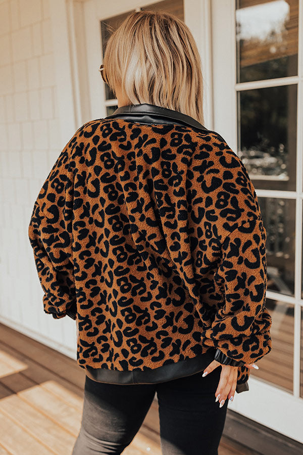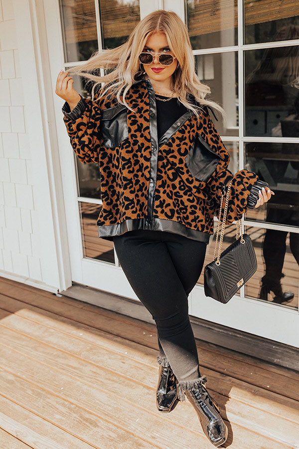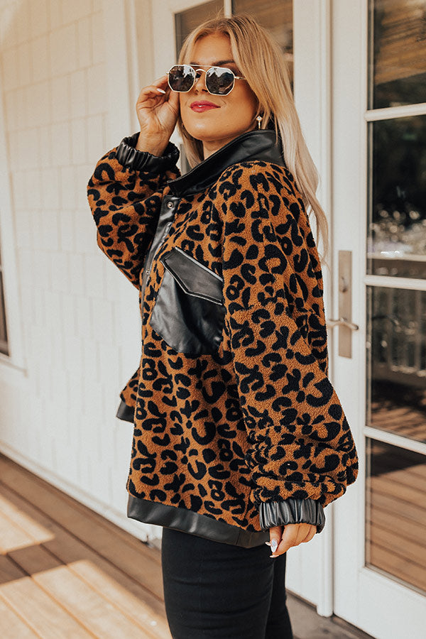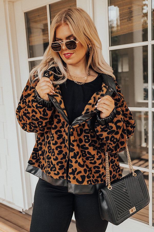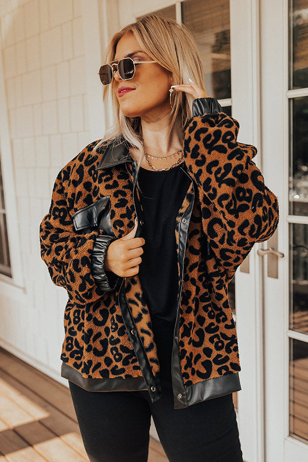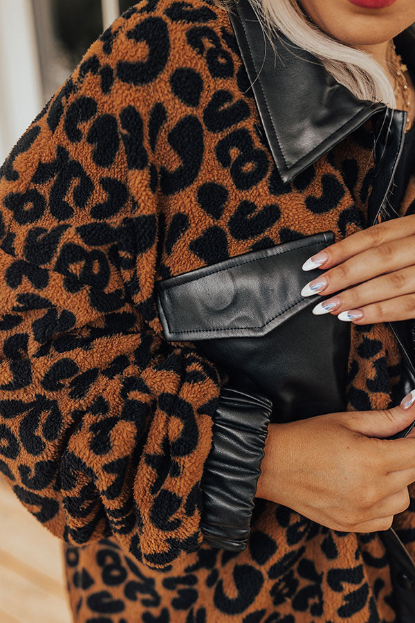 This cozy-chic jacket is the trendy addition your closet needs! Features plush camel colored leopard print material with black faux leather collar, front button closure, functional leather pockets with flap closure, long loose sleeves with leather elastic banded cuffs, and a relaxed silhouette that falls into a straight leather trimmed hemline.