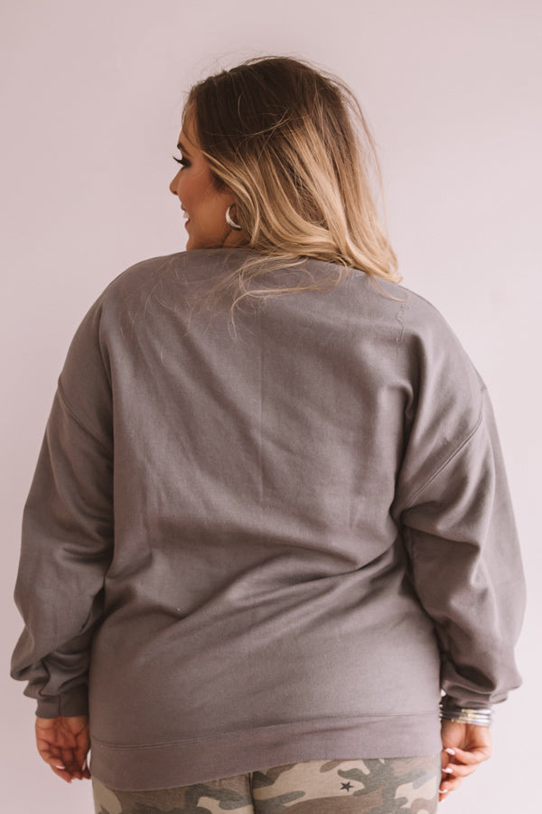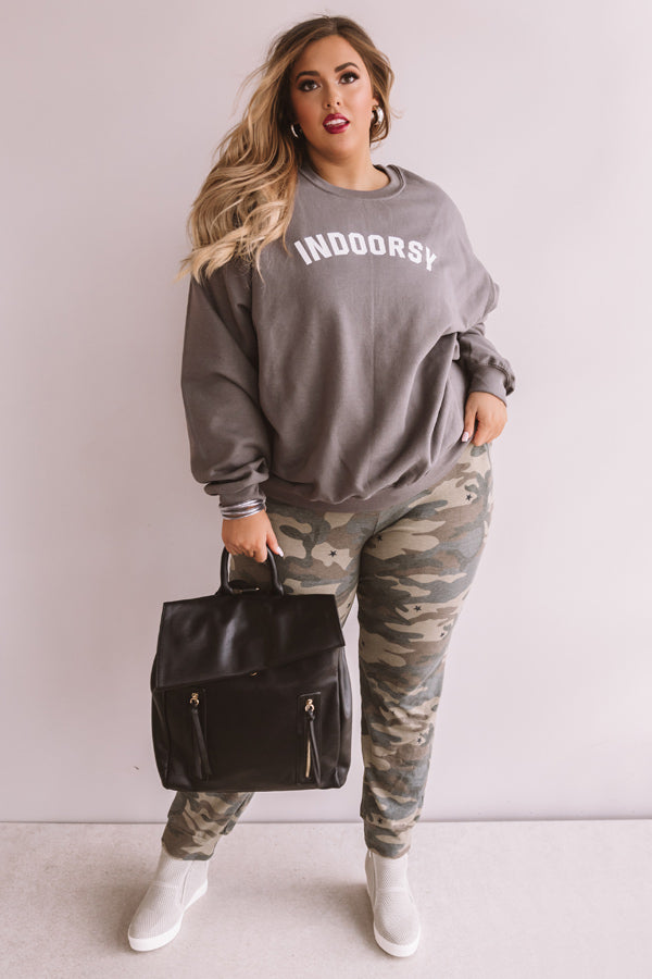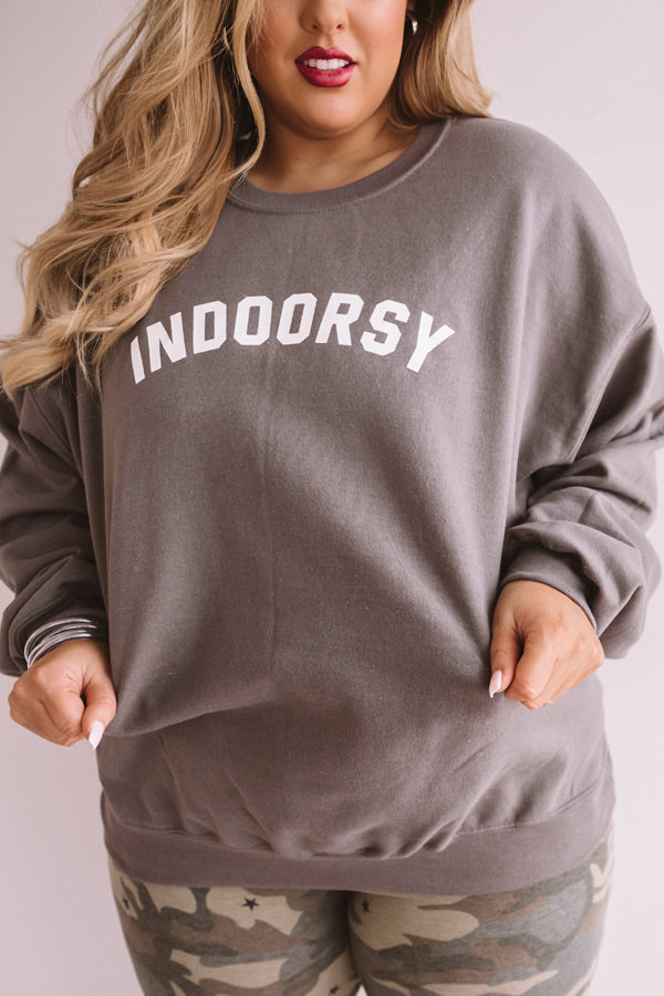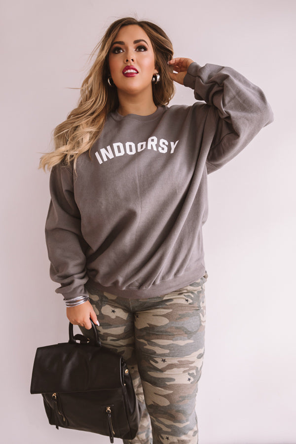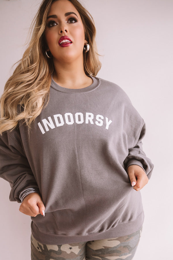 Plus Size - May your OOTD be comfy with our grey "Indoorsy" sweatshirt featuring soft and warm lightweight material, a high rounded neckline, long loose sleeves with fitted cuffs, adorable white lettering on the front, and a relaxed silhouette that falls into a straight hemline! You can wear this piece a variety of ways, like dressed down with some athleisure leggings, a faux leather backpack, and a wedged sneaker, or styled up with some distressed light wash ankle skinnies, "The Emmaline Bootie in Black," and our "All Caught Up Headband in Black!" Measurements