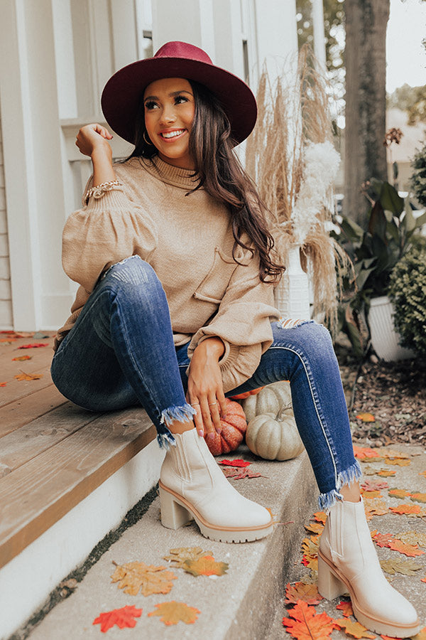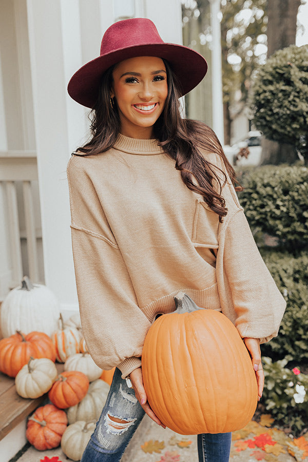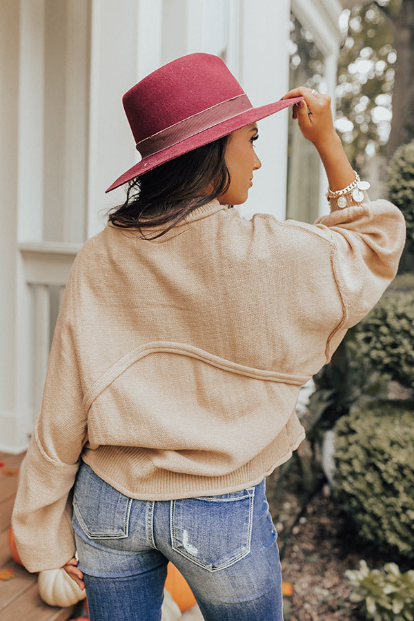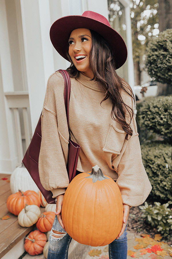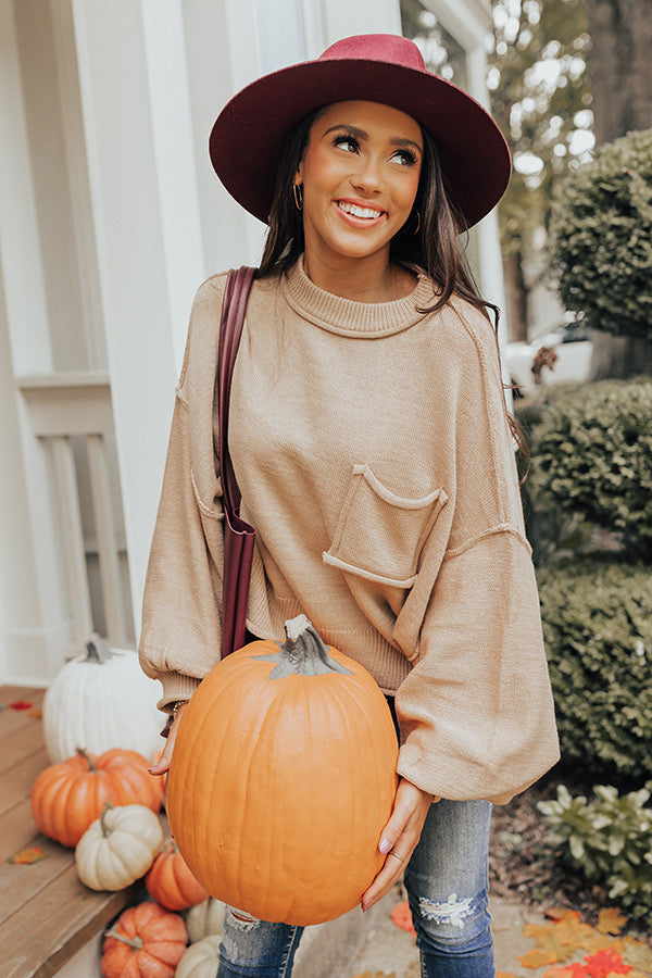 This khaki knit sweater is both cozy and versatile. It features a single breast pocket, dolman sleeves, exposed seams, and ribbing at the neckline, waist, and sleeve cuffs.