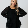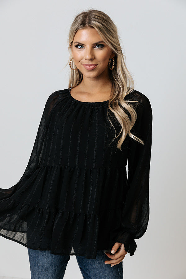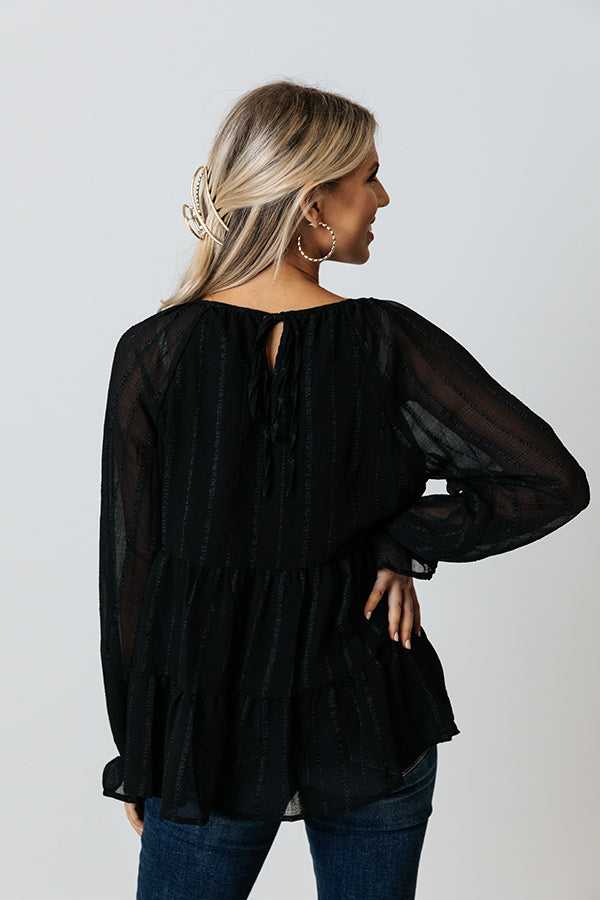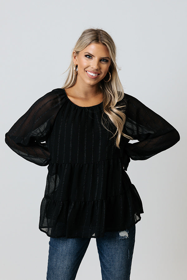 We promise you will be infinitely grateful that you added this adorable black top to your cart with its lightweight material, shiny vertical accent stripes, a rounded neckline with a tie closure in the back, long bishop sleeves with flared cuffs, and a relaxed babydoll silhouette that falls into a peplum hemline!