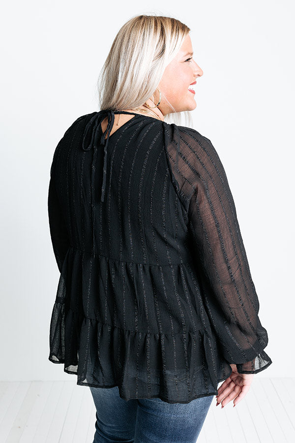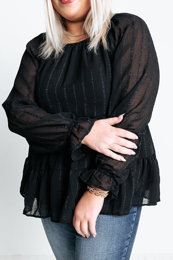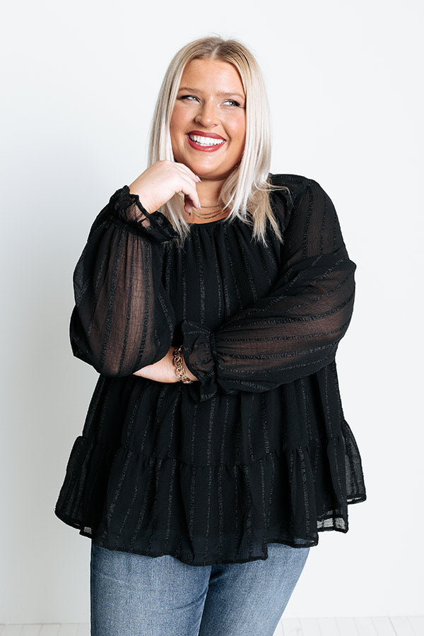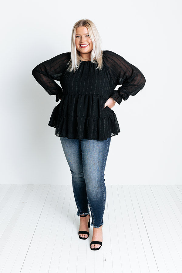 We promise you will be infinitely grateful that you added this adorable plus size black top to your cart with its lightweight material, shiny vertical accent stripes, a rounded neckline with a tie closure in the back, long bishop sleeves with flared cuffs, and a relaxed babydoll silhouette that falls into a peplum hemline! Measurements