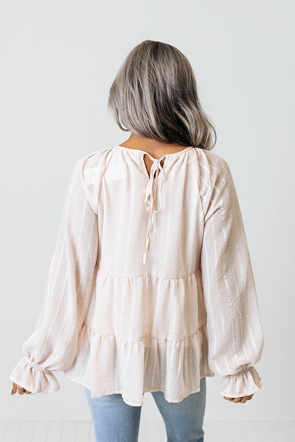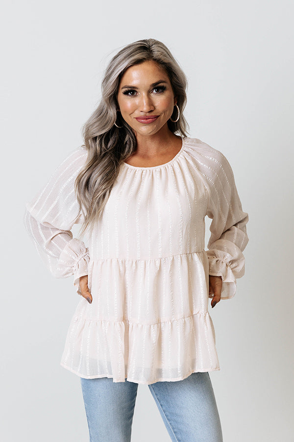 We promise you will be infinitely grateful that you added this adorable light pink top to your cart with its lightweight material, shiny vertical accent stripes, a rounded neckline with a tie closure in the back, long bishop sleeves with flared cuffs, and a relaxed babydoll silhouette that falls into a peplum hemline!