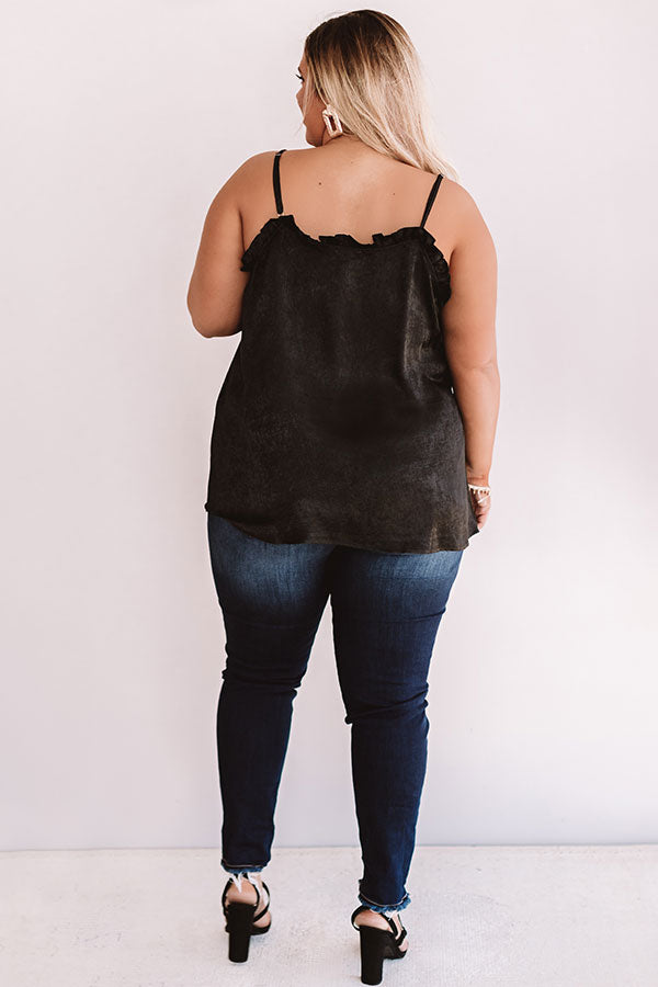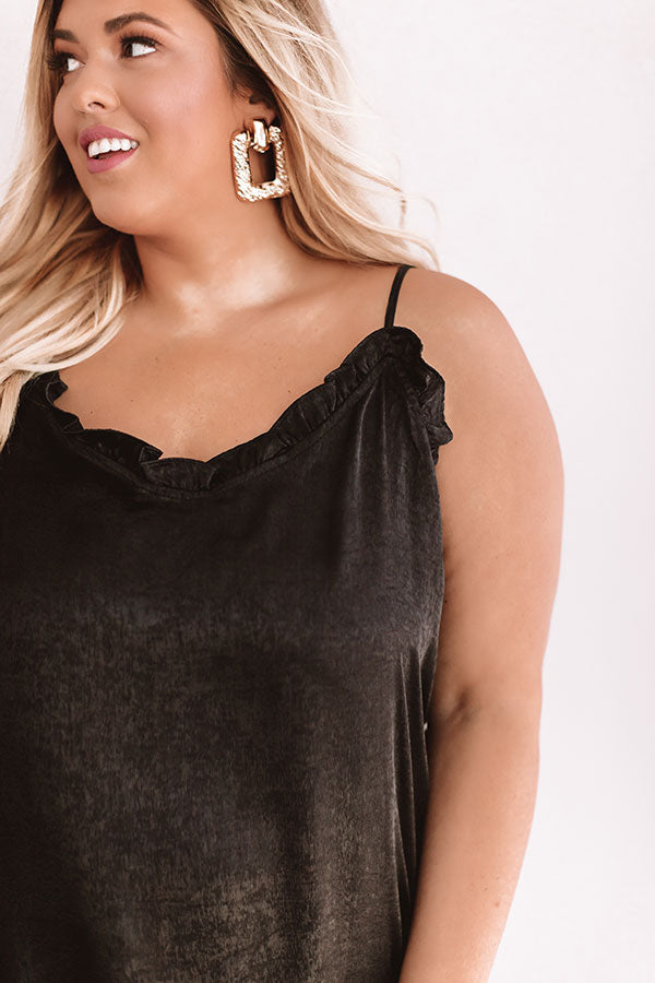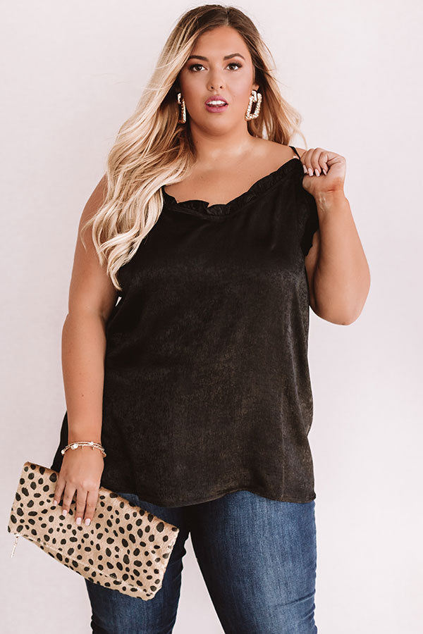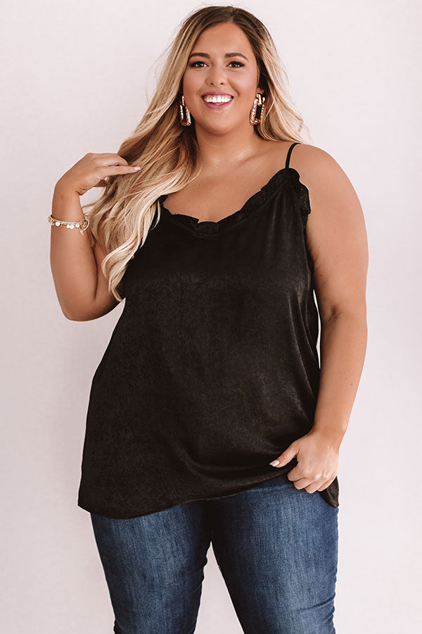 Plus Size - Release your "inner glow" with this black shift tank featuring a ruffled neckline, adjustable spaghetti straps, and satin fabric! This versatile basic can be styled with just about anything and for every season! We have paired it with some dark cuffed jeans and black heels, but it can also be worn with our fuchsia "Out And About Skirt" and the "Byrdie Leopard Wedge" for a "glow-getting" summer look! Measurements