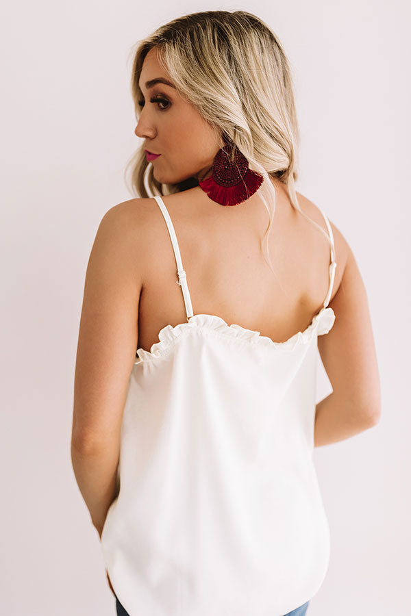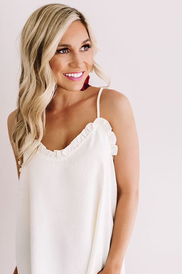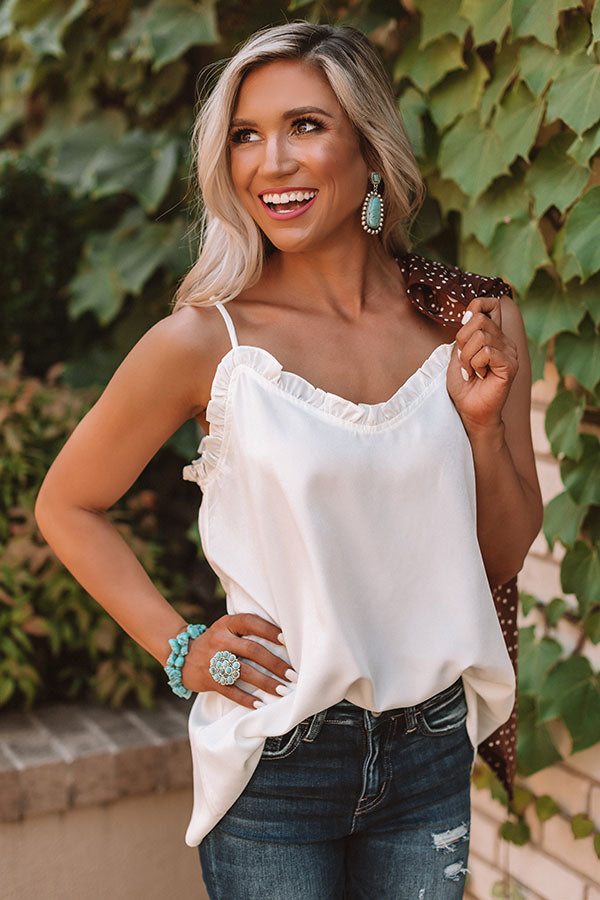 Release your "inner glow" with this cream shift tank featuring a ruffled neckline, adjustable spaghetti straps, and satin fabric! This versatile basic can be styled with just about anything and for every season! We have paired it with some dark bell bottoms and red statement earrings, but it can also be worn with our "Pocket Full of Sunshine High Waist Shorts" and "The Eliza Espadrille in Pink" for a "glow-getting" summer look! Measurements