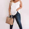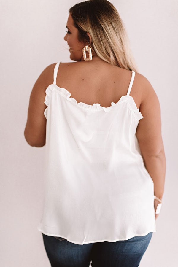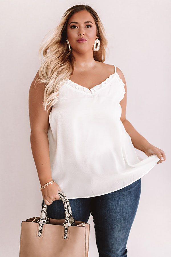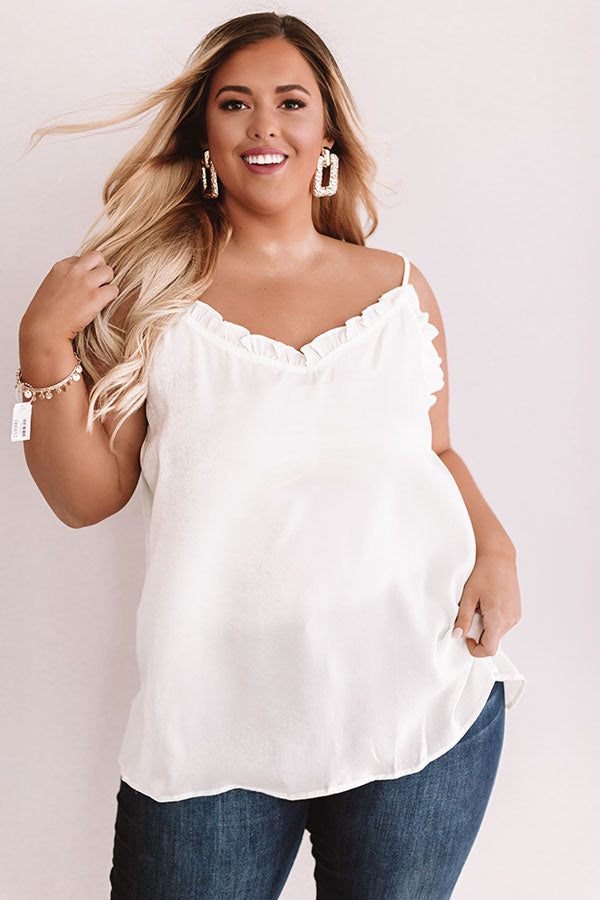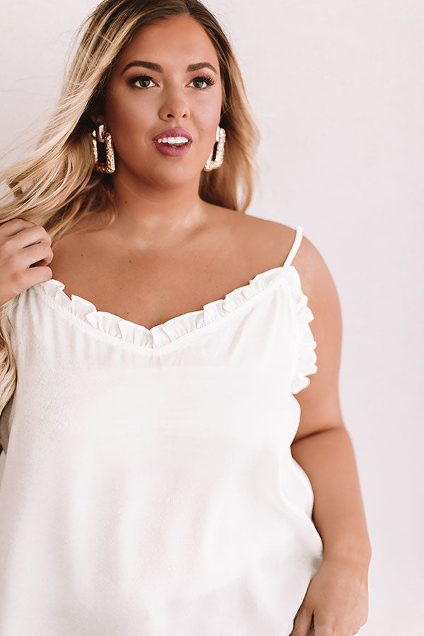 Plus Size - Release your "inner glow" with this cream shift tank featuring a ruffled neckline, adjustable spaghetti straps, and satin fabric! This versatile basic can be styled with just about anything and for every season! We have paired it with some dark bell bottoms and red statement earrings, but it can also be worn with our "Pocket Full of Sunshine High Waist Shorts" and "The Eliza Espadrille in Pink" for a "glow-getting" summer look! Measurements
