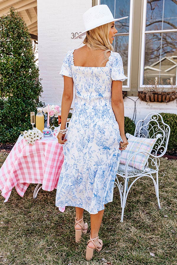 We have no doubt you will be instantly obsessed with this beautiful white midi dress featuring lightweight material patterned with a blue vintage floral print, a straight neckline and upper back, short puff sleeves, and a flattering silhouette that falls into a straight mid-calf length hemline with an accent slit!