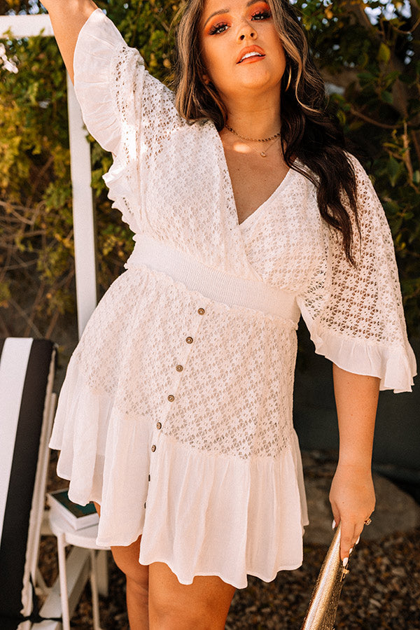 You are sure to look like a spring beauty when you wear this darling ivory colored plus size romper featuring lightweight lace material, a faux wrap bodice, a v-cut neckline and upper back with a tie closure, loose 3/4-length sleeves, a cinched waistline, a button down front, and a relaxed shorts silhouette that ends in straight ruffled upper-thigh length hemlines!